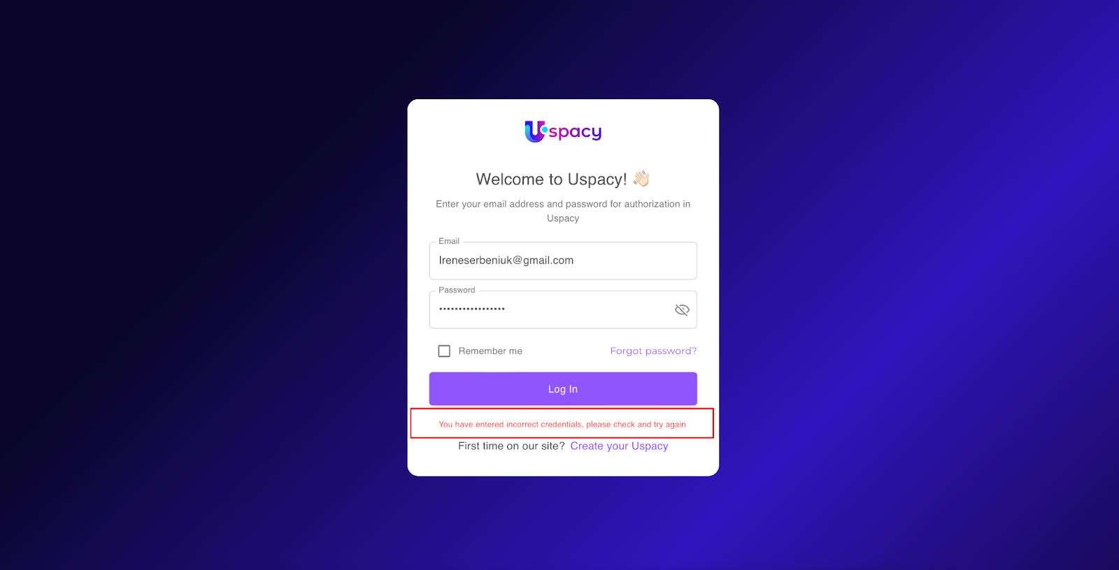 ❗️ If the login or password is entered with errors, the verification will not be passed. And the system will inform you about incorrect authorization data. You will need to check everything and try again.