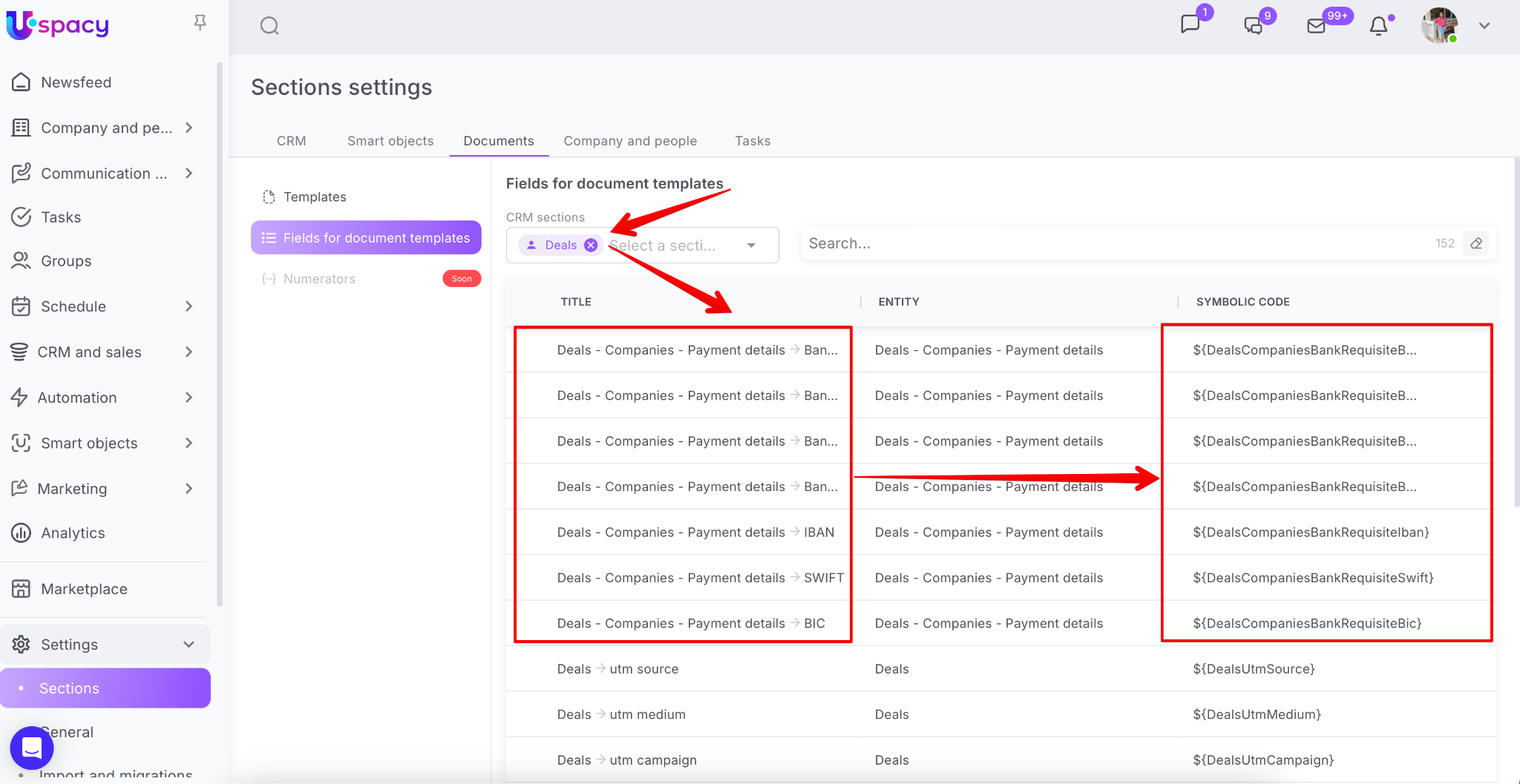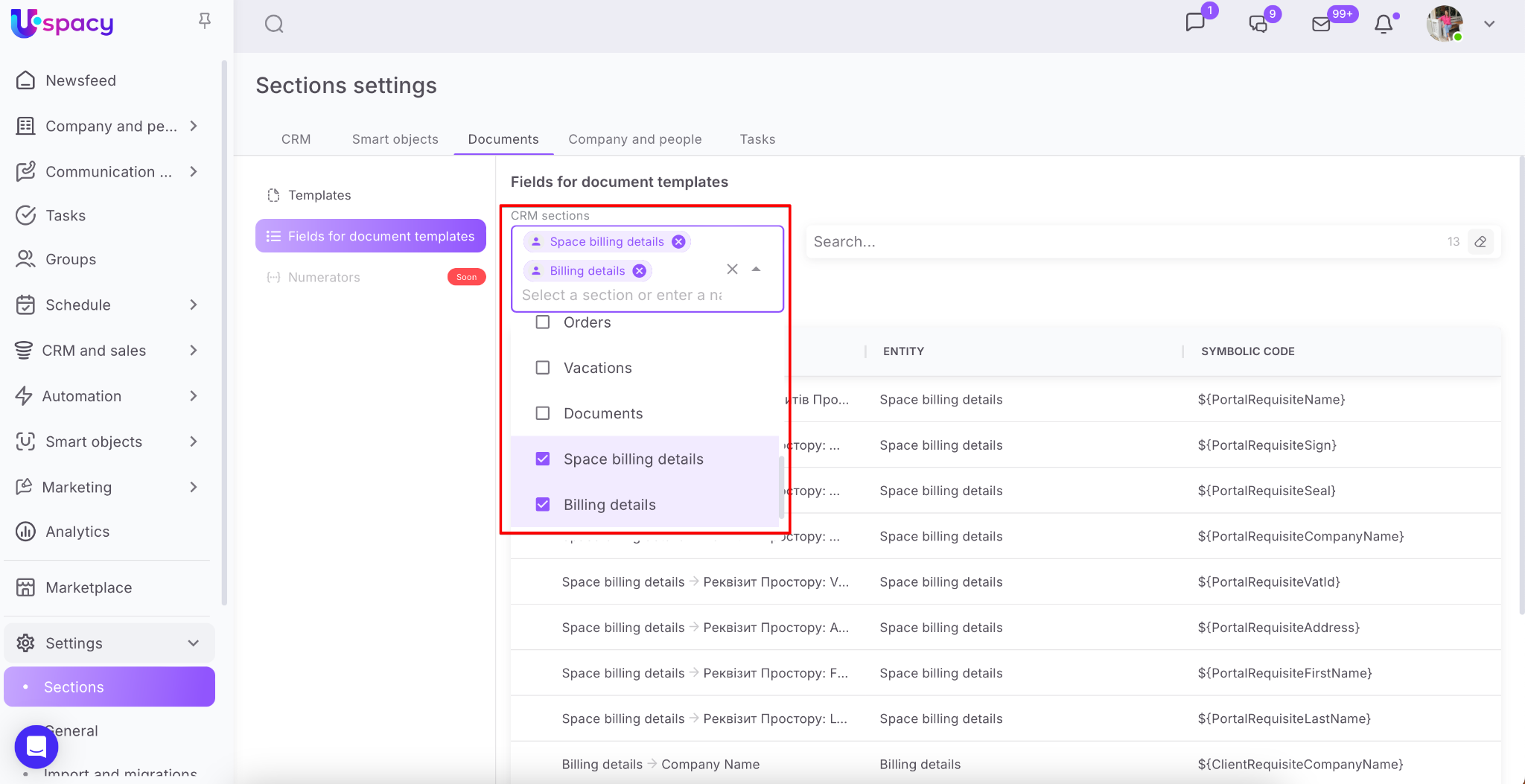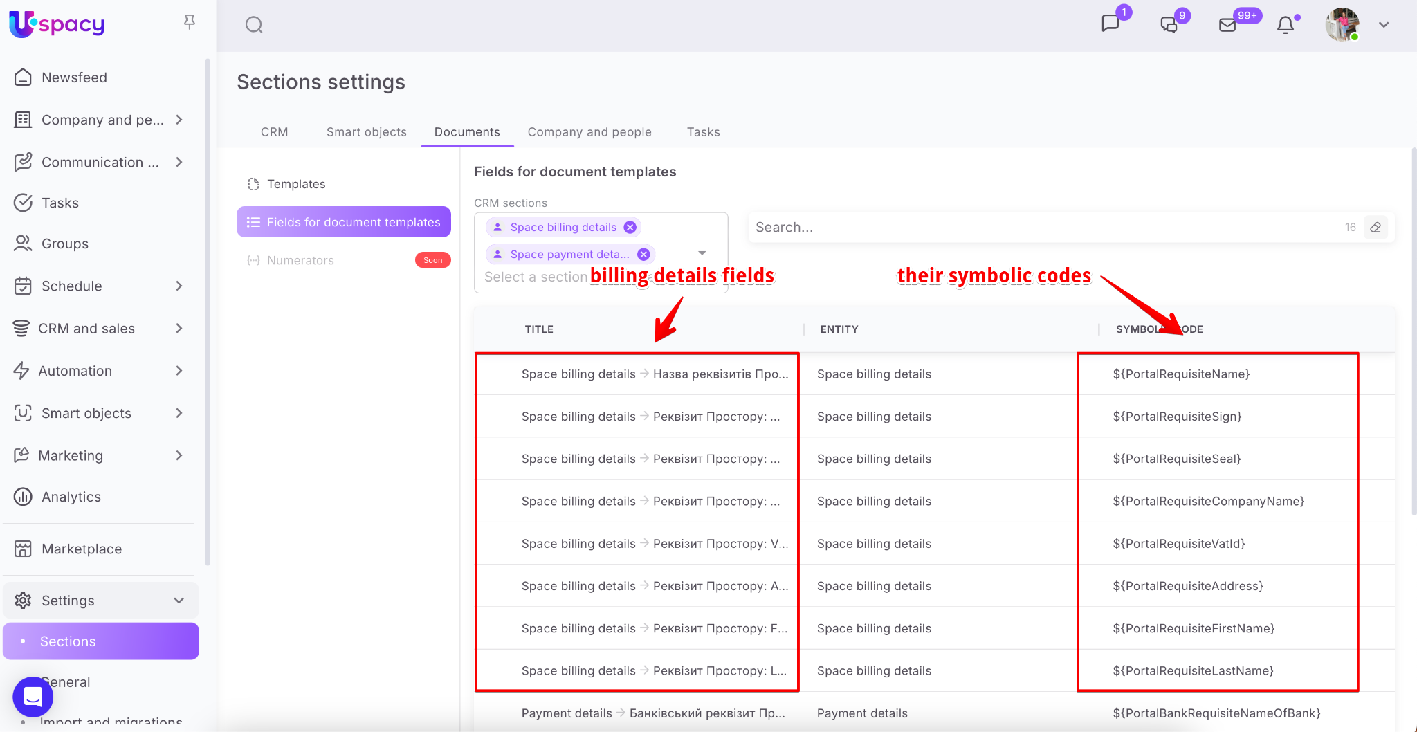 🟣 symbolic codes for fields from the Billing details and Payment details sections. This will ensure that the billing details of the company/contact from the CRM card in which the document is generated are uploaded to the document.
