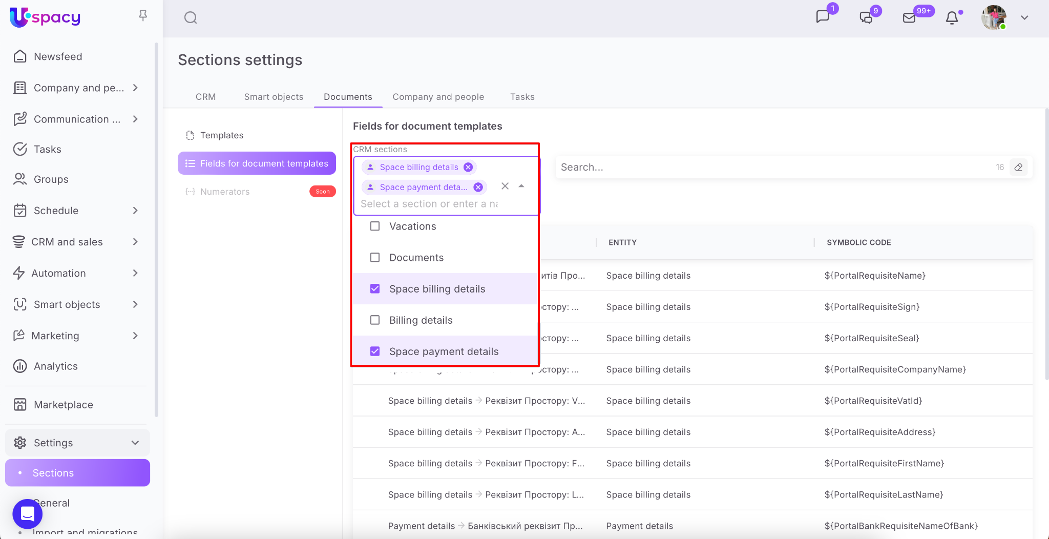 To quickly find the symbolic codes of the Space billing details fields and the Space payment details fields, use the CRM Sections filter.