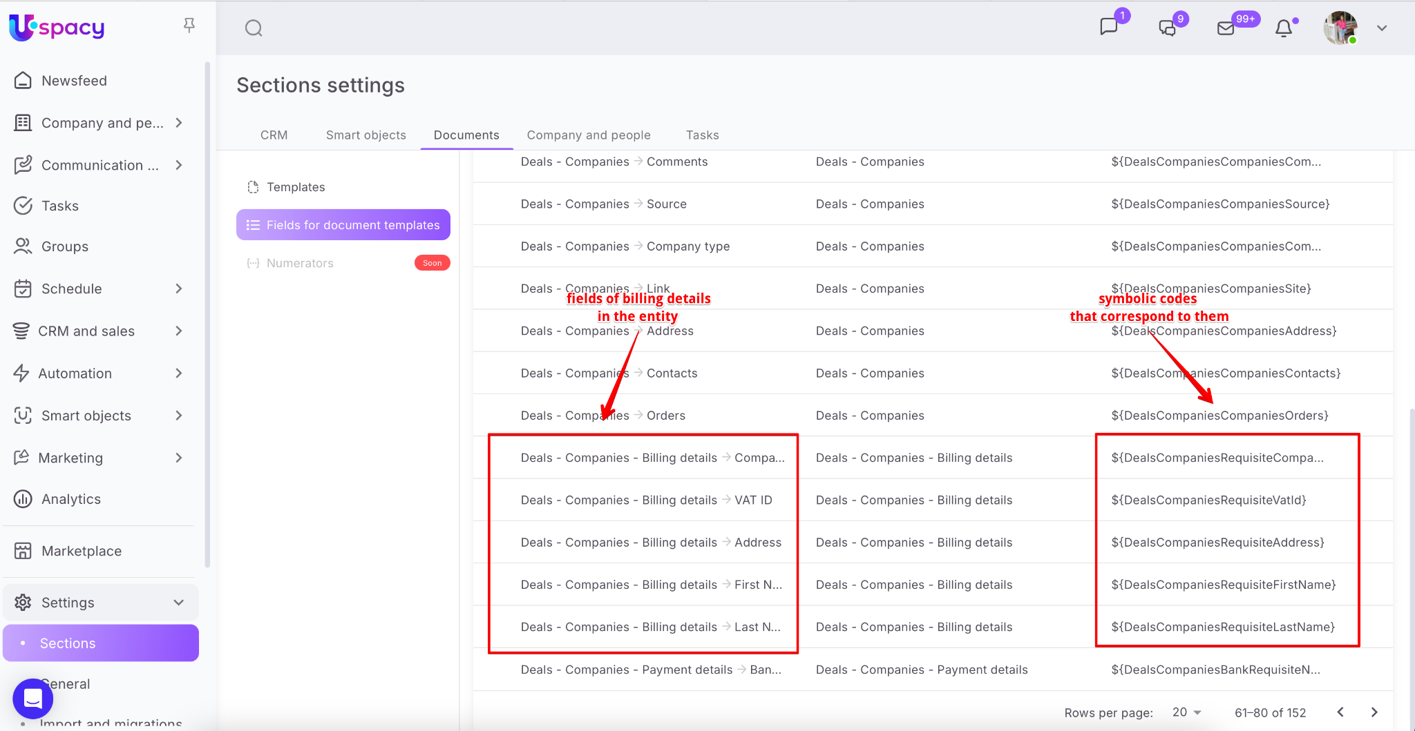 🟣 symbolic codes for fields from the Contacts section. This will ensure that the billing details of the companies bound to the contact (and vice versa of the contacts bound to the company) from the CRM card in which the document is generated are uploaded to the document.