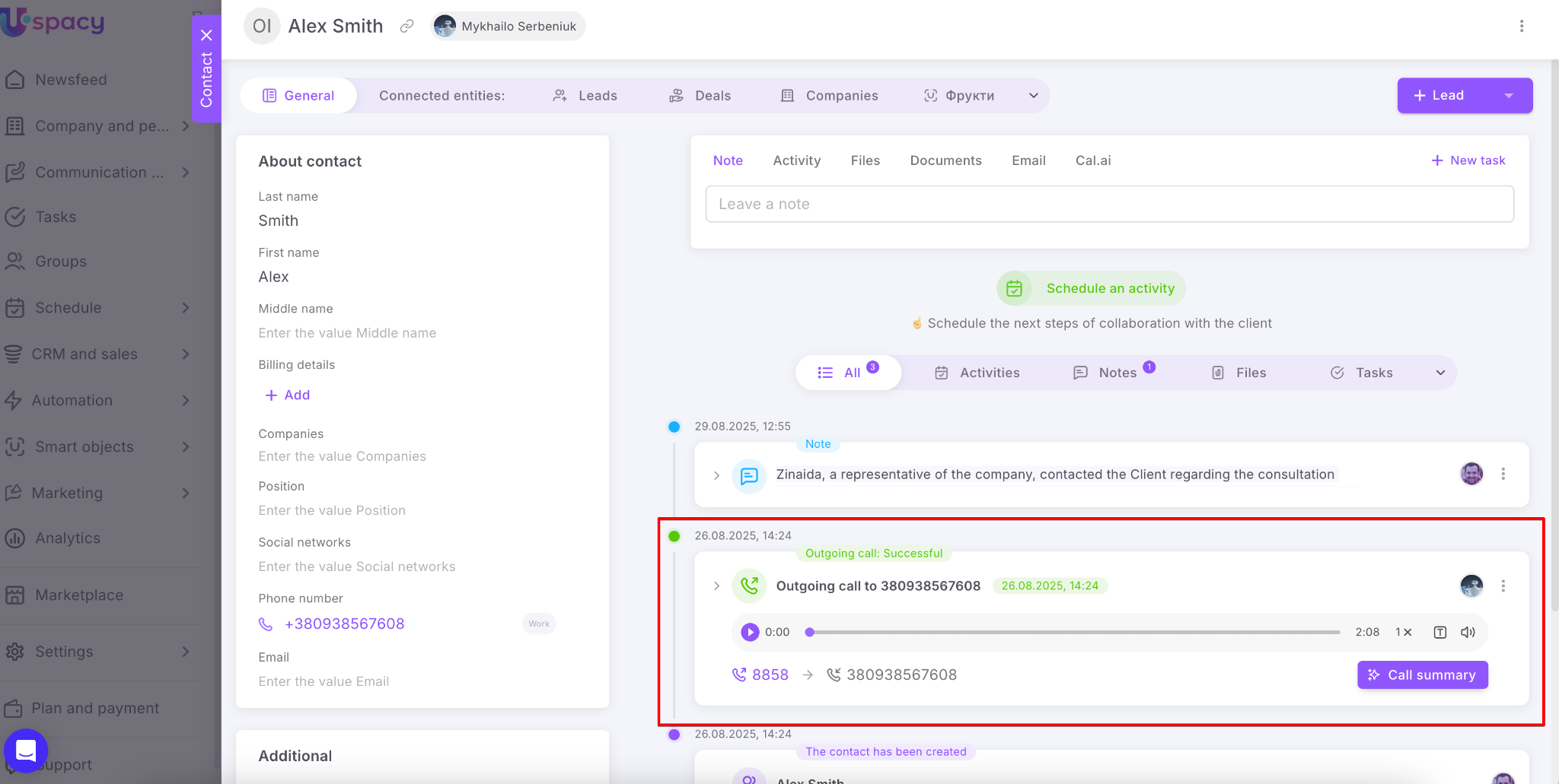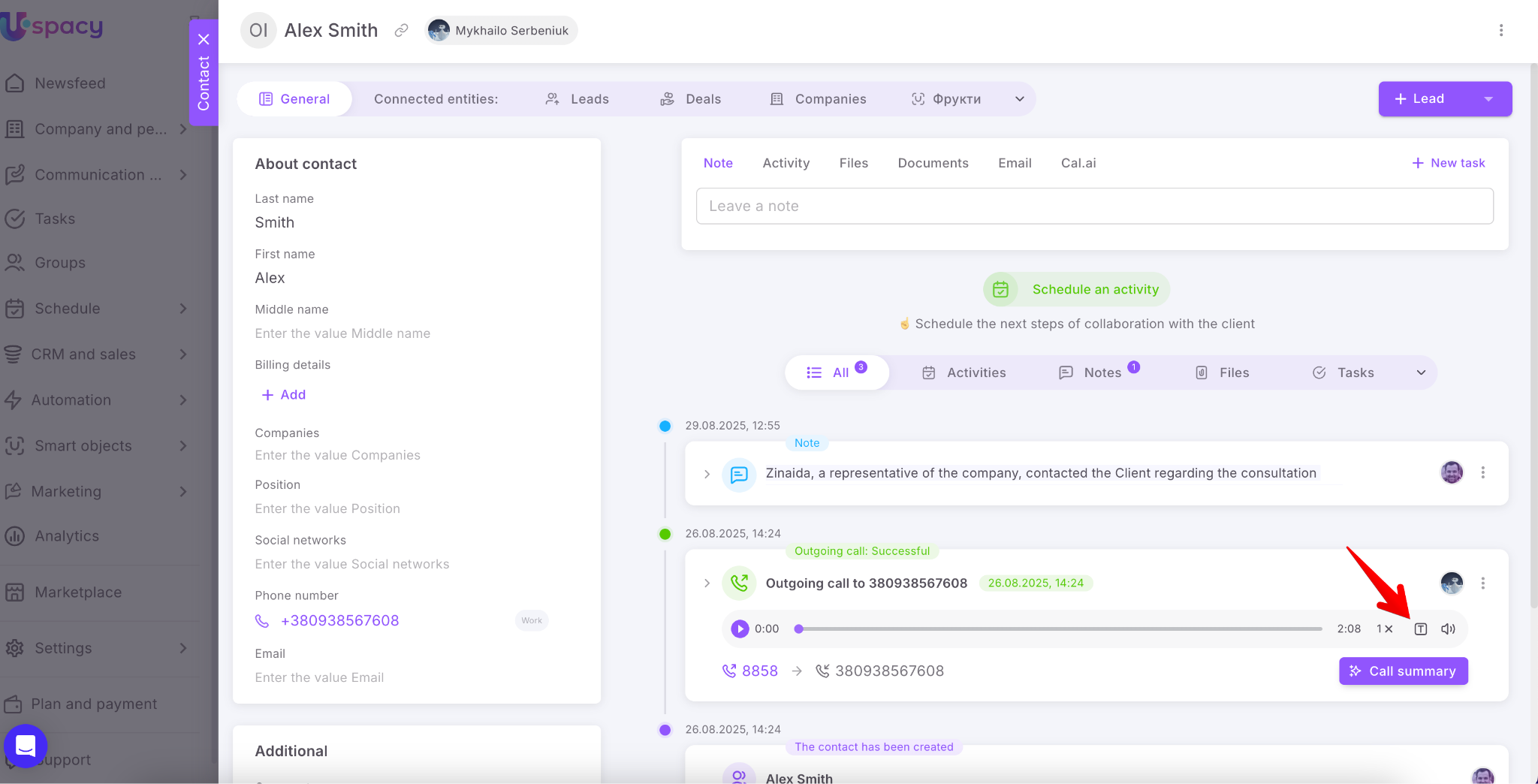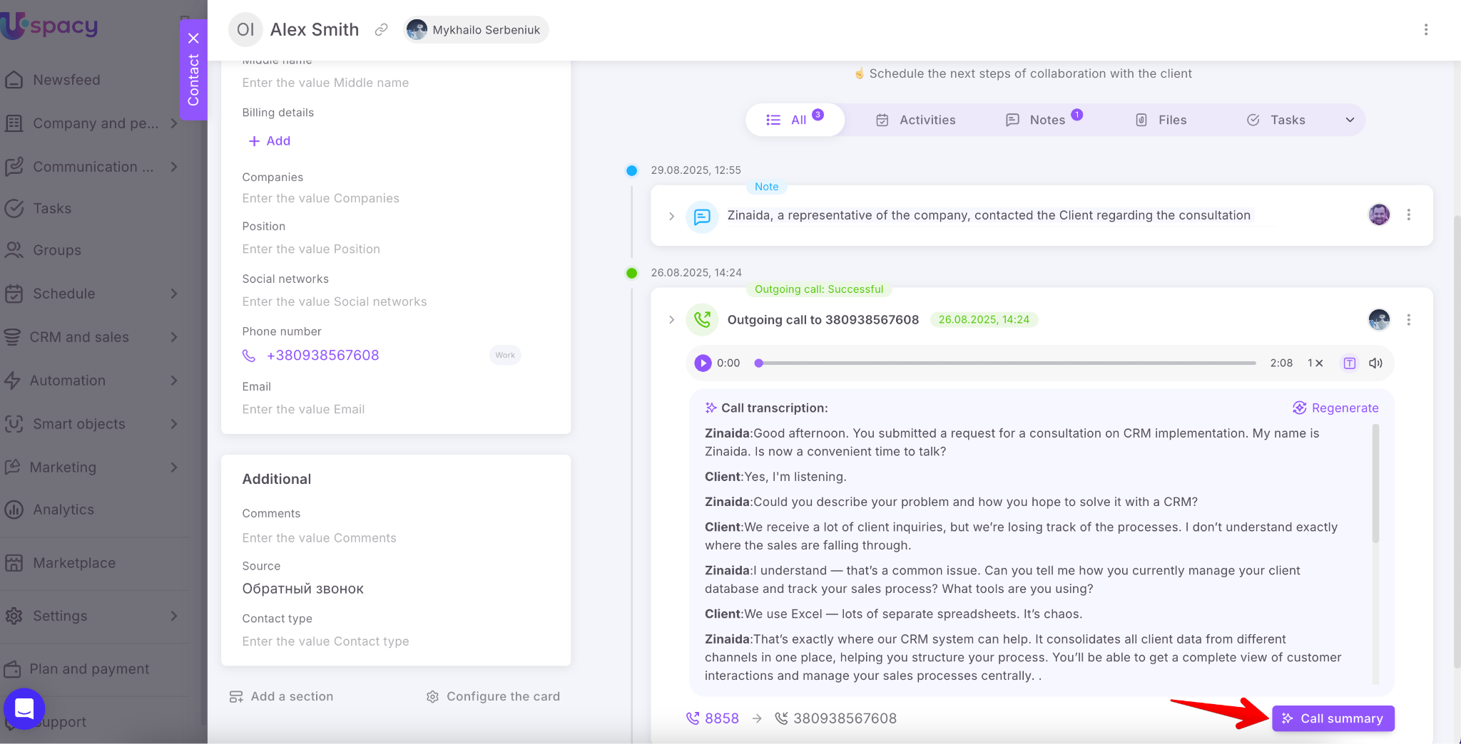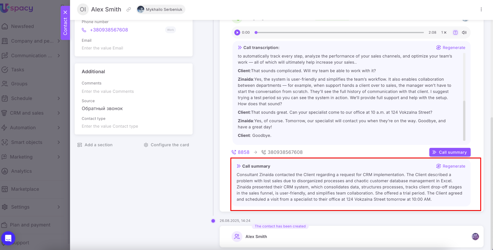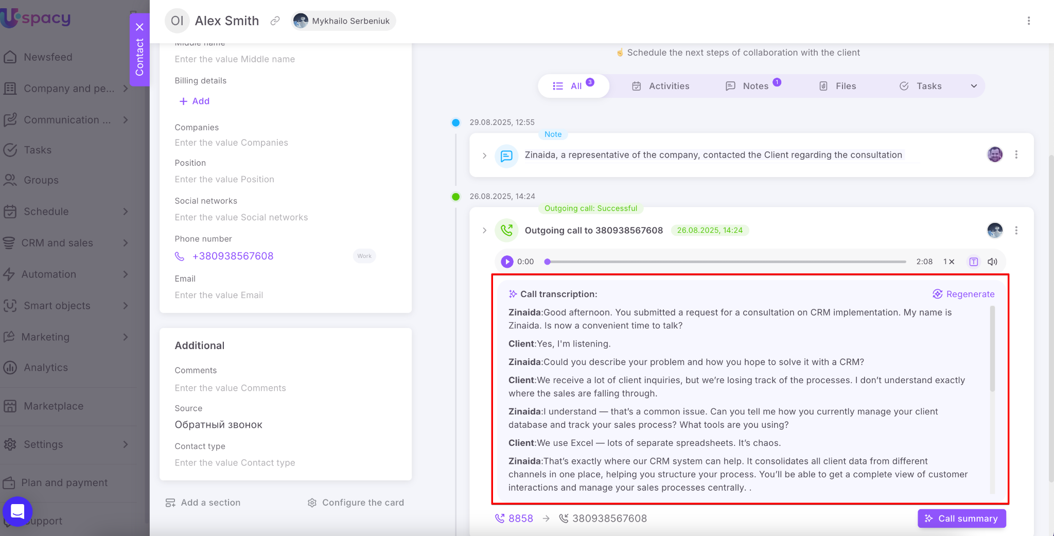Uspacy helps keep a record of all client interactions and automates call processing. The system can now automatically transcribe calls (convert speech into text) and generate a brief summary of the conversation. This makes it easy to find important information, reduce manual note-taking, and keep all data directly in the CRM card.