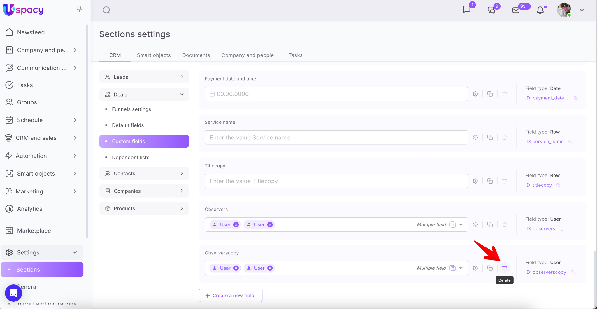 Unlike default fields, custom fields can be deleted. To do this, just click on the trash bin icon. The field will disappear from the list.