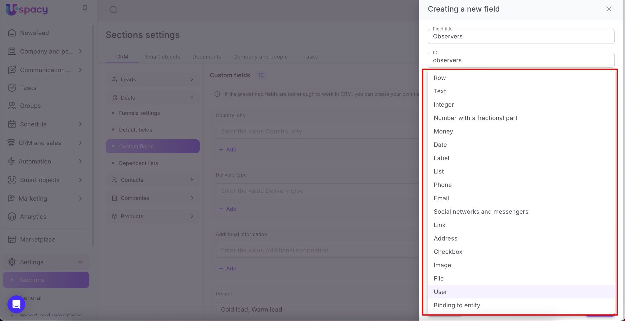 ❗️The same list of field types is provided for all entities. But for products it is different. You can NOT create a Social networks and messengers type field for them (it will not be available for selection from the list).
