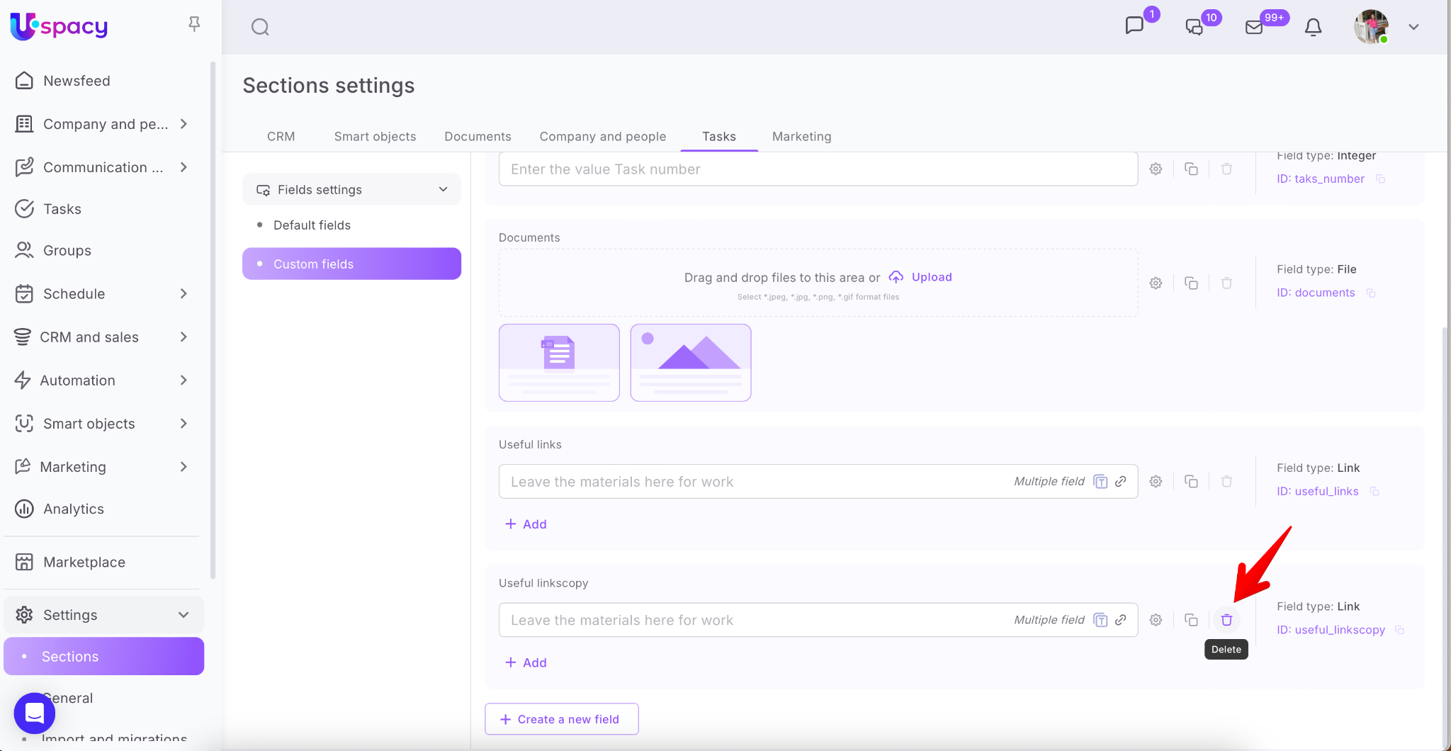 Unlike standard fields, custom fields can be deleted by clicking the trash icon. The field will be removed from the list immediately.
