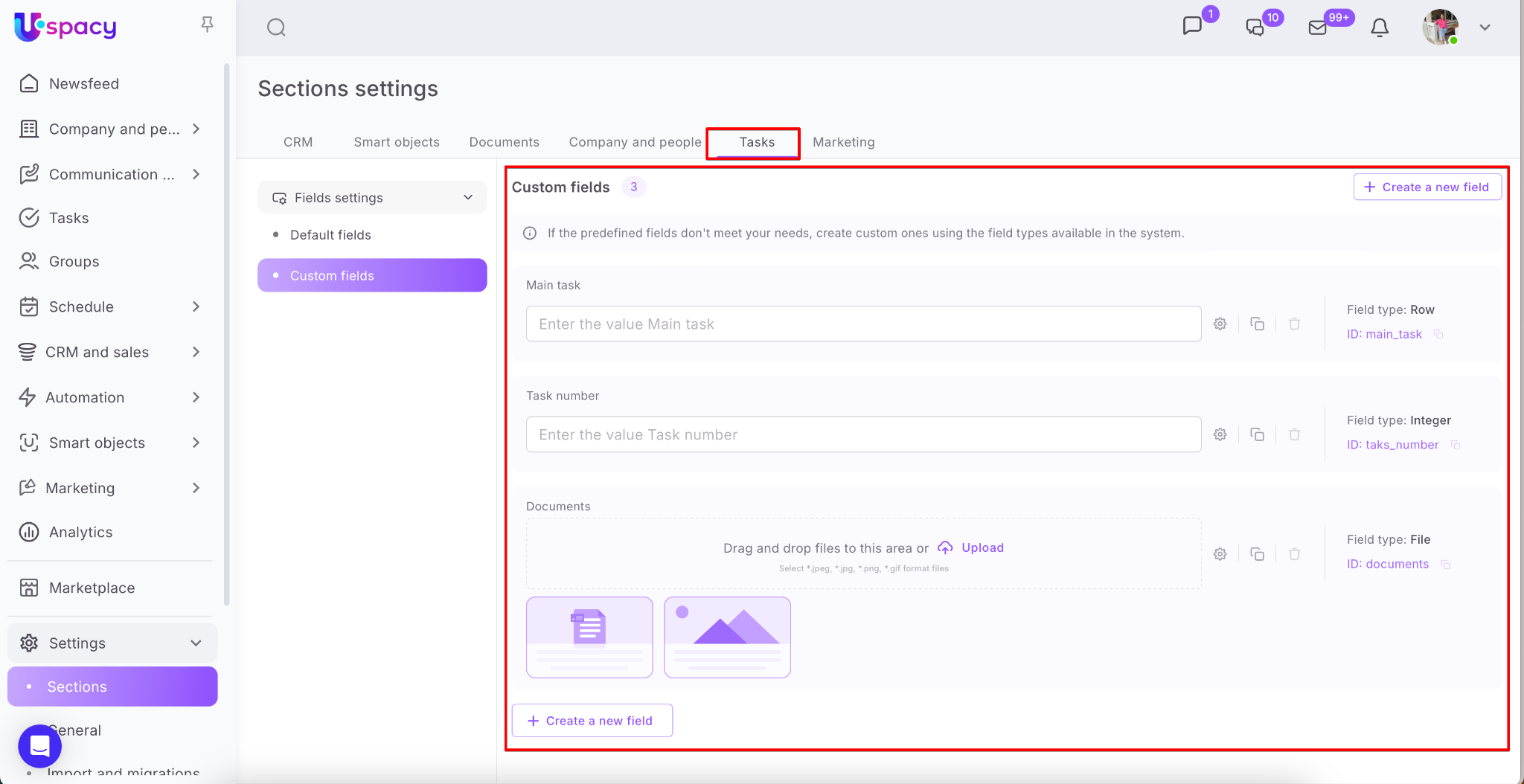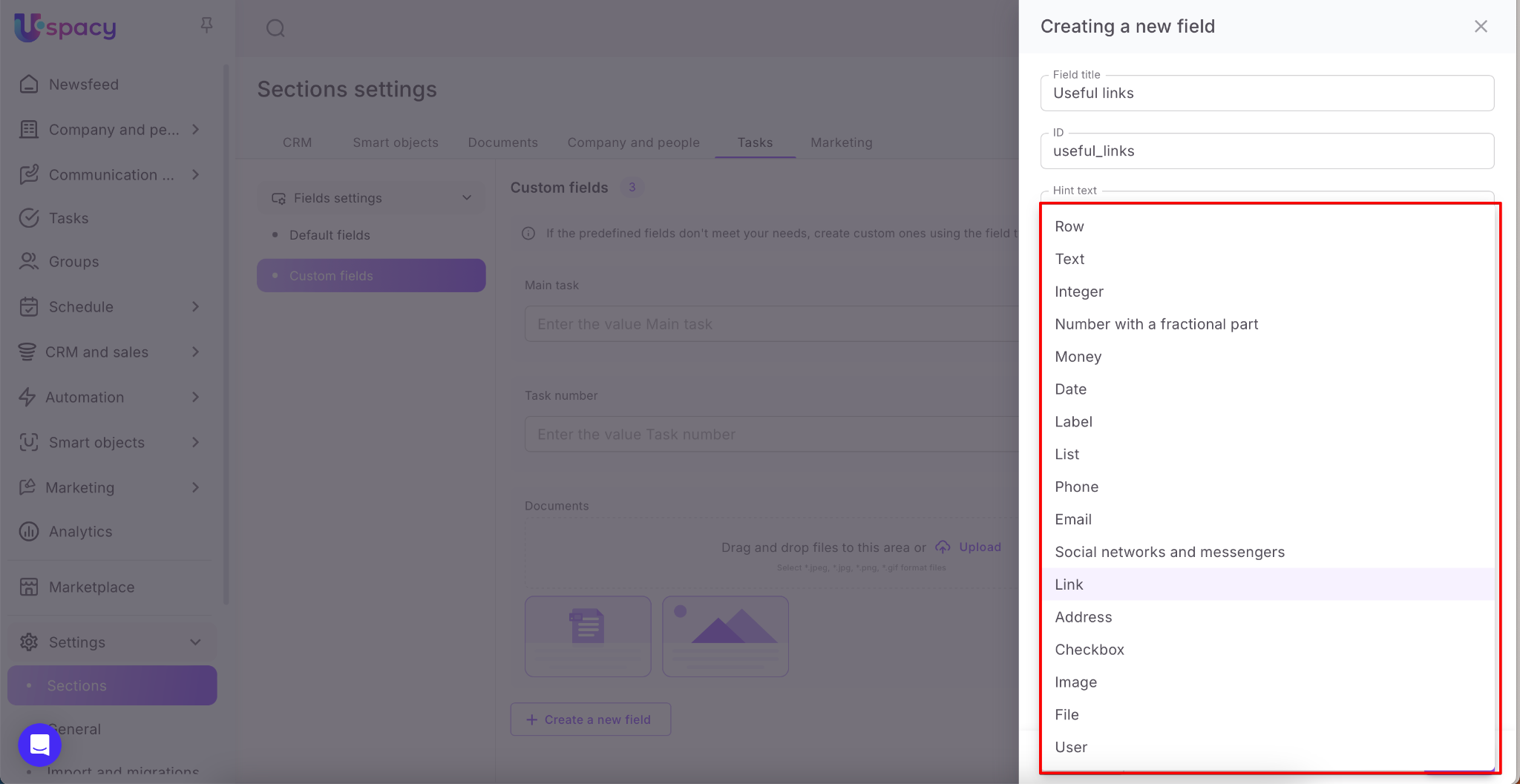 ๐ก The available field types are similar to those in CRM, except for "Binding to entity", which is not available in Tasks.