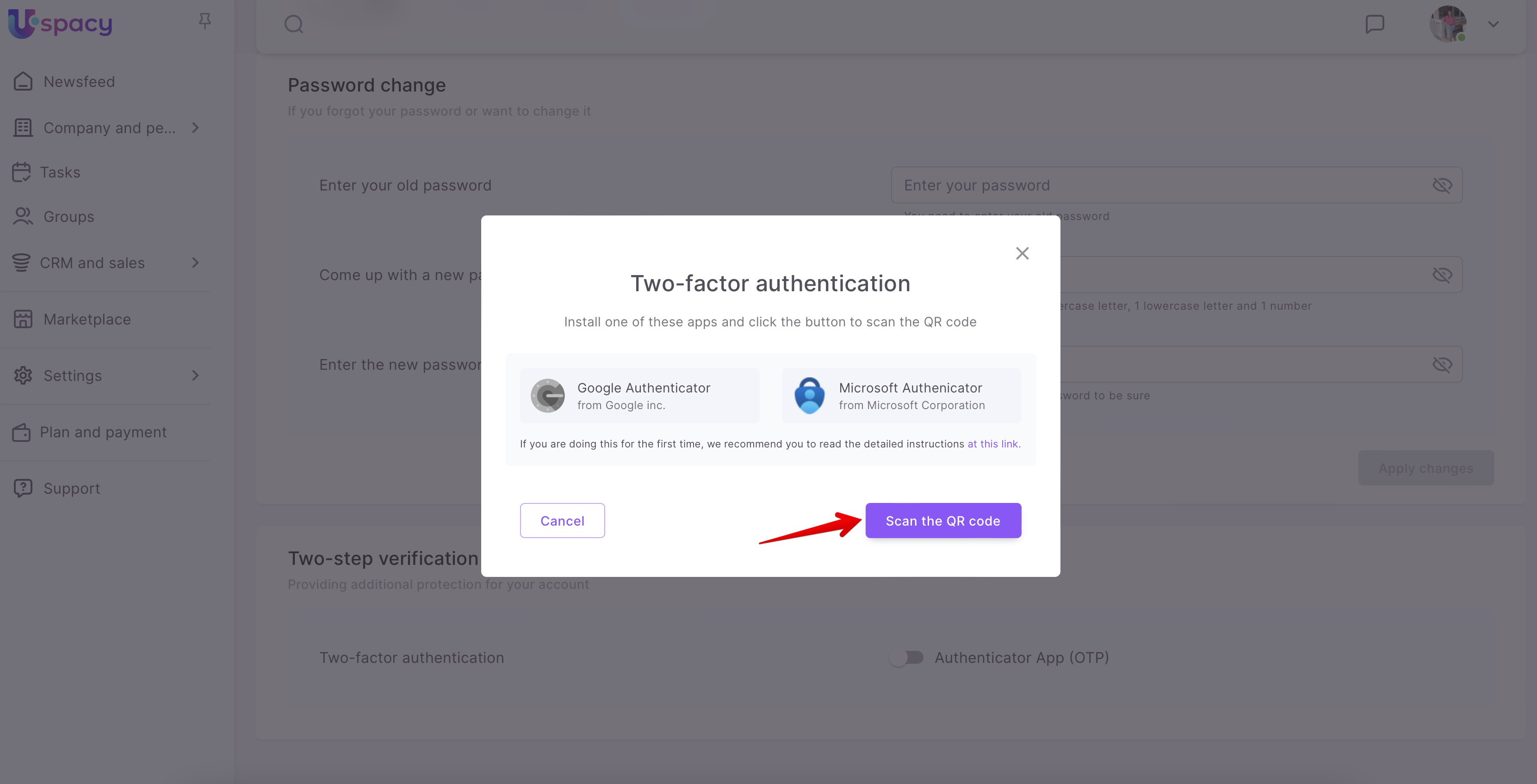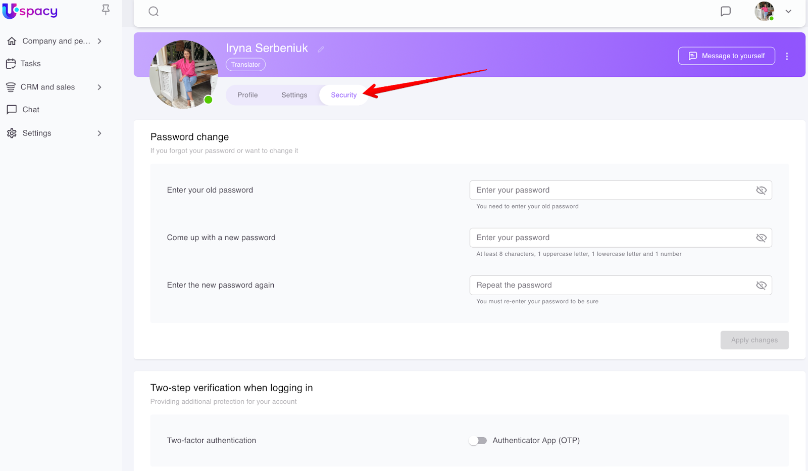 Two-factor authentication (OTP) is one of the components of additional protection and security of the Uspacy user account.