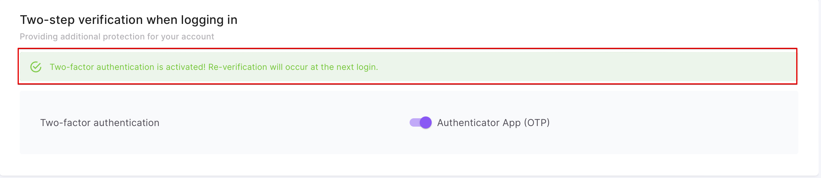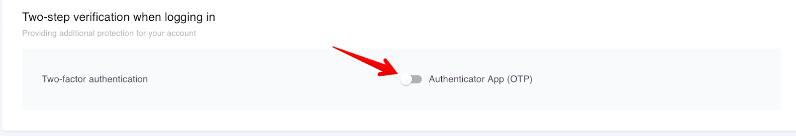 You can do this in the Two-step verification block when logging in. So, to activate the OTP, you need to click on the toggle button.
