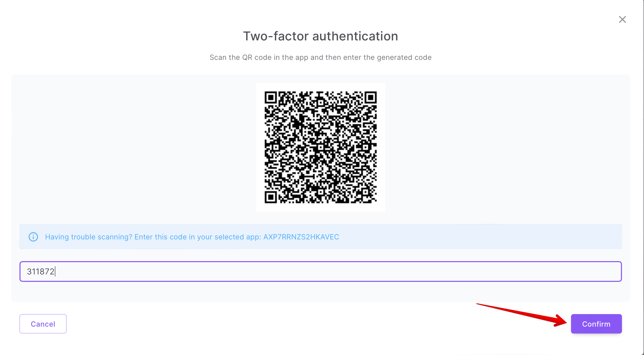 So, next you need to scan the QR code that will be shown in your profile on the form to enable two-factor authentication: