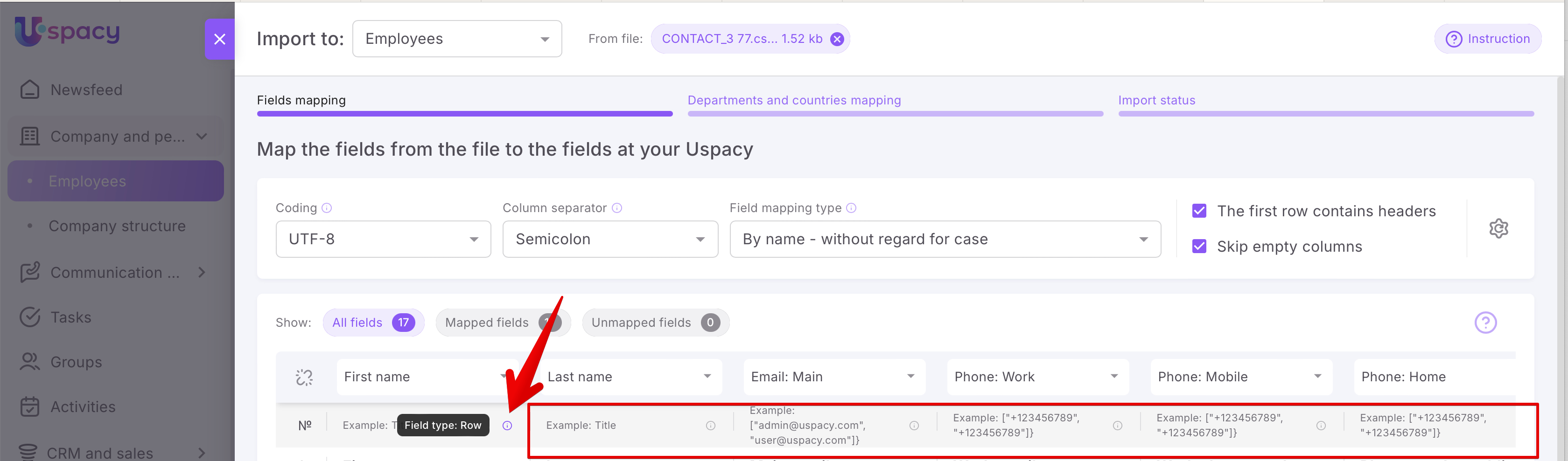 The columns in it will be mapped to the fields at Uspacy. And each row of the file is data about a separate employee.