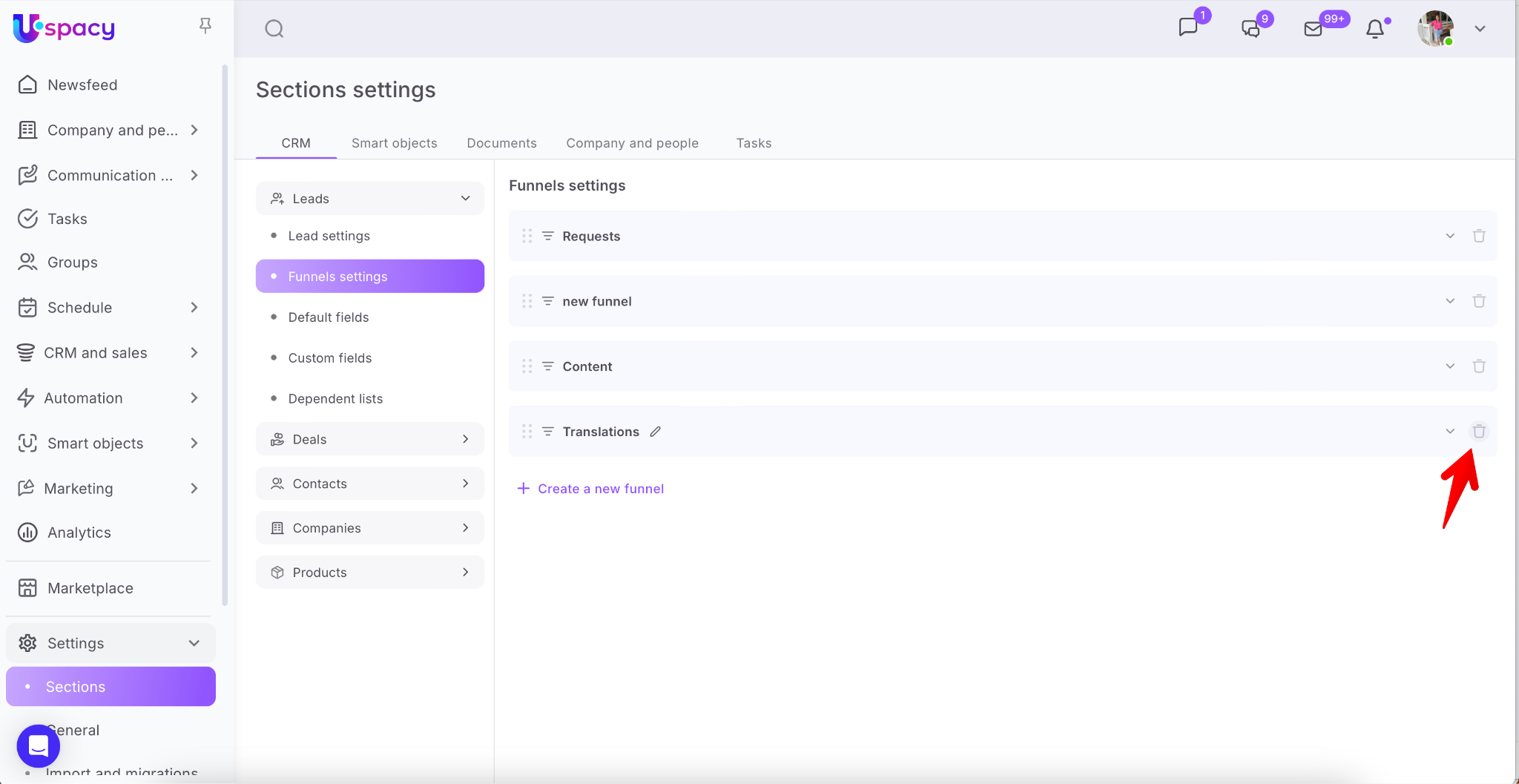 You can also delete it on the page Settings – Sections – Deals or Leads – Funnels settings. To do this, click on the trash icon, next to the name of the desired one.
