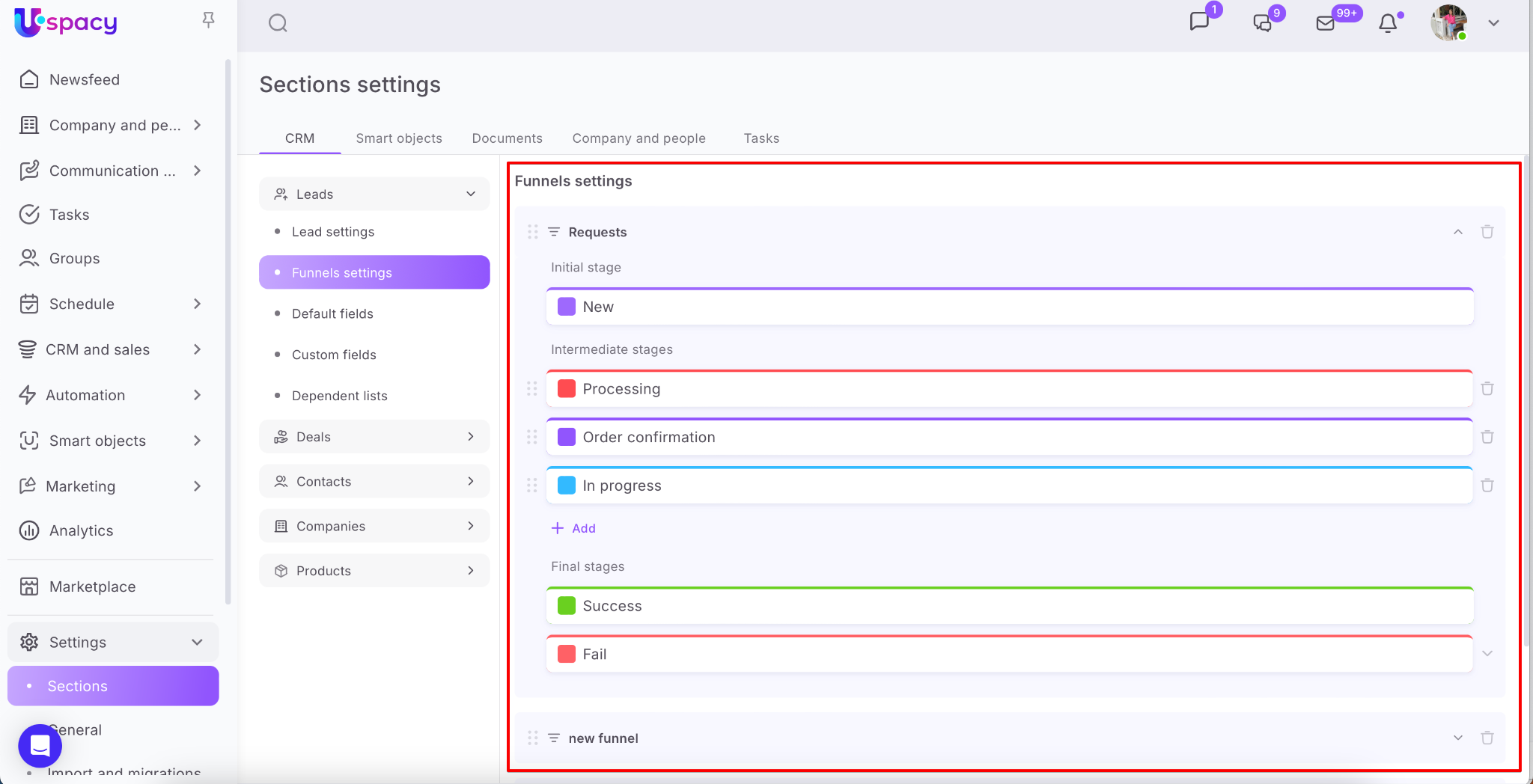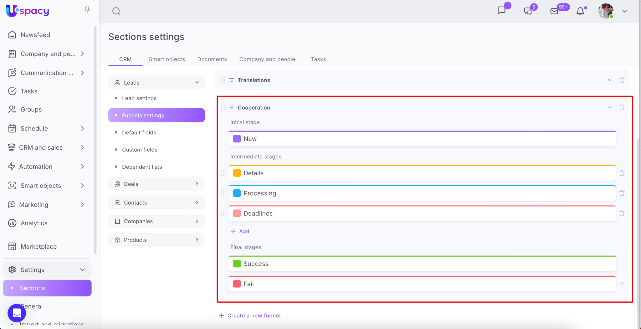 Open the CRM section, then go to either the Leads or Deals tab. In the Funnels settings section, click the Create a new funnel button.