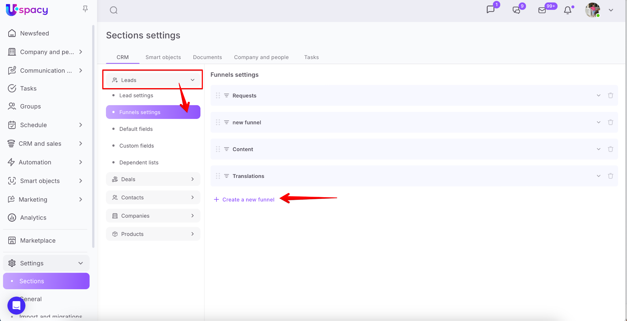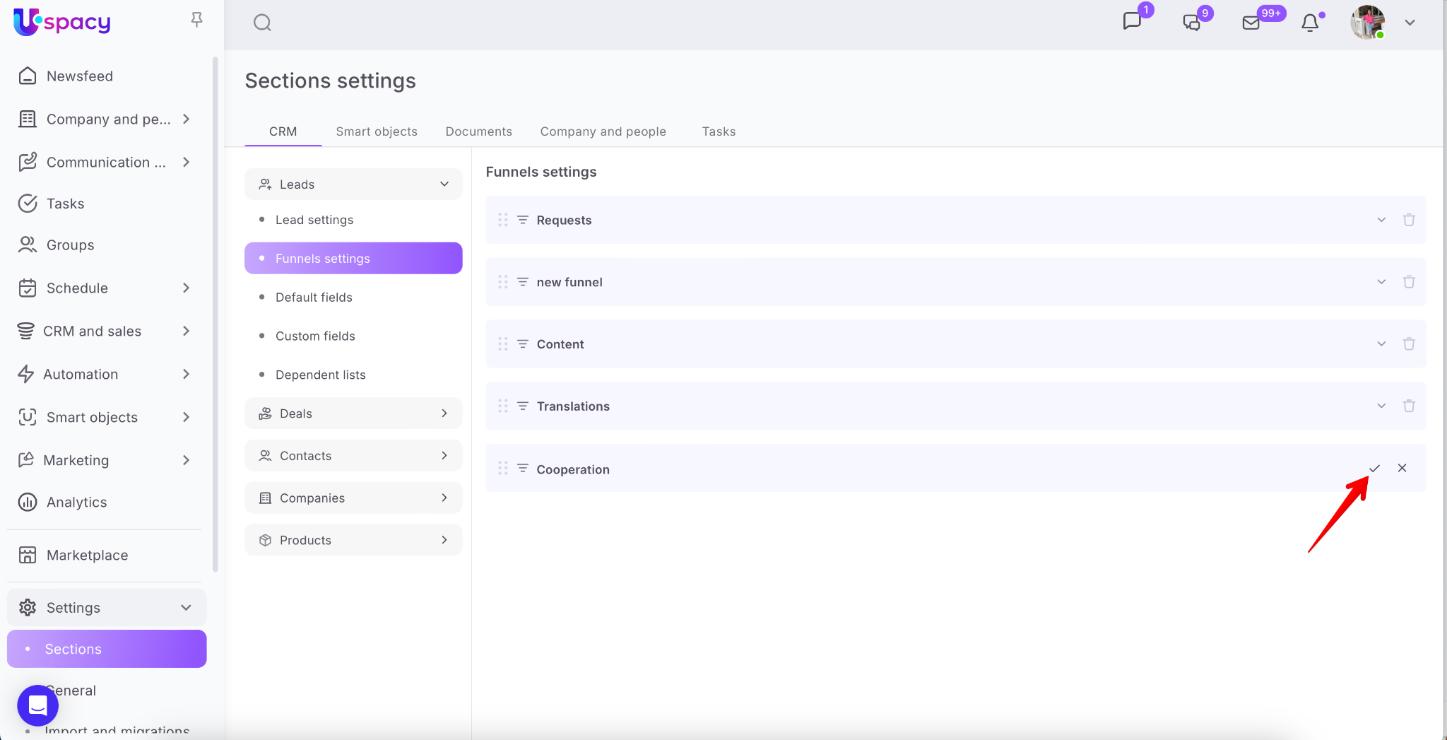 In addition, you can add a new funnel for deals in the Settings - Sections. To go to it, you need to use the left menu or click on the gear (Configure item).