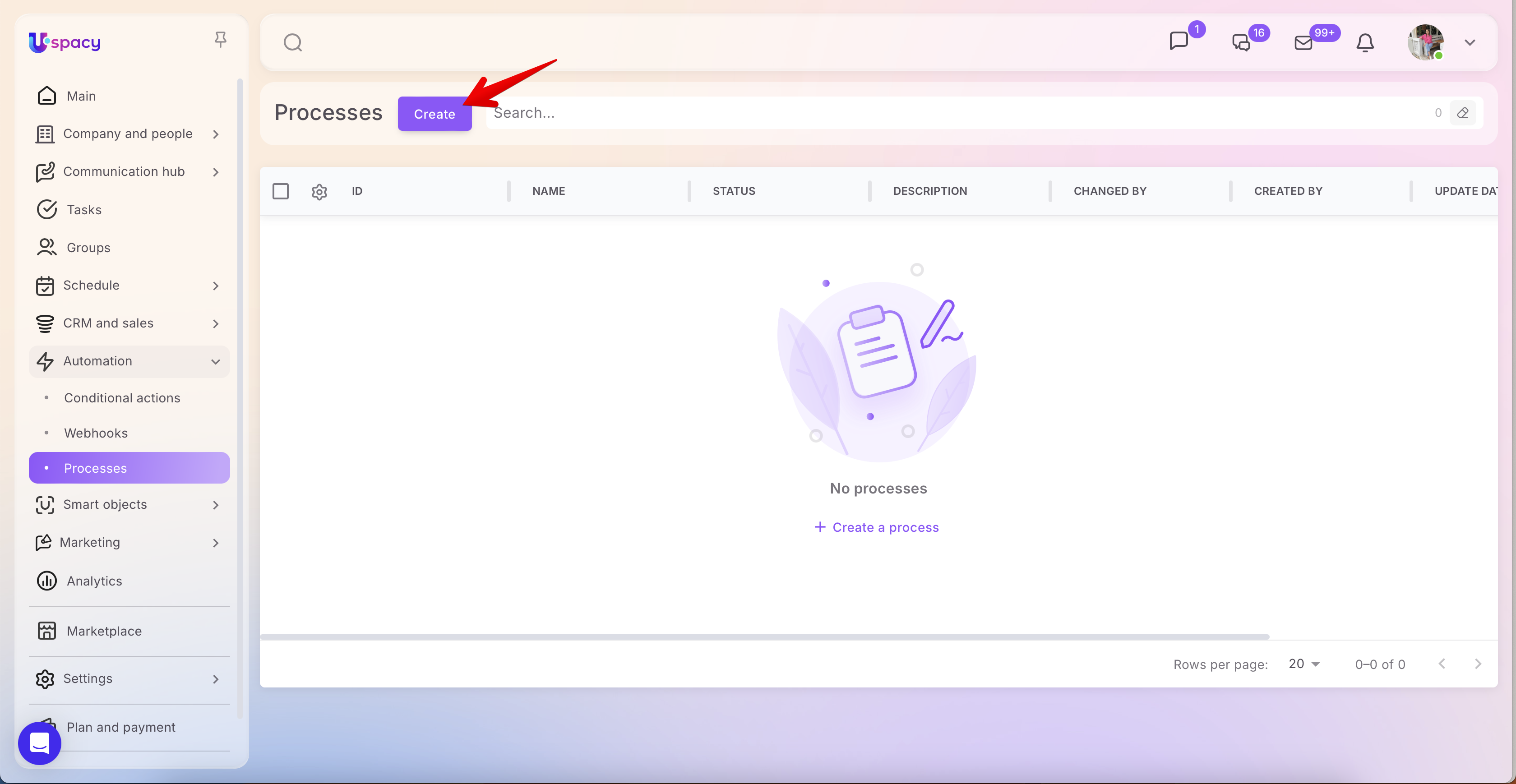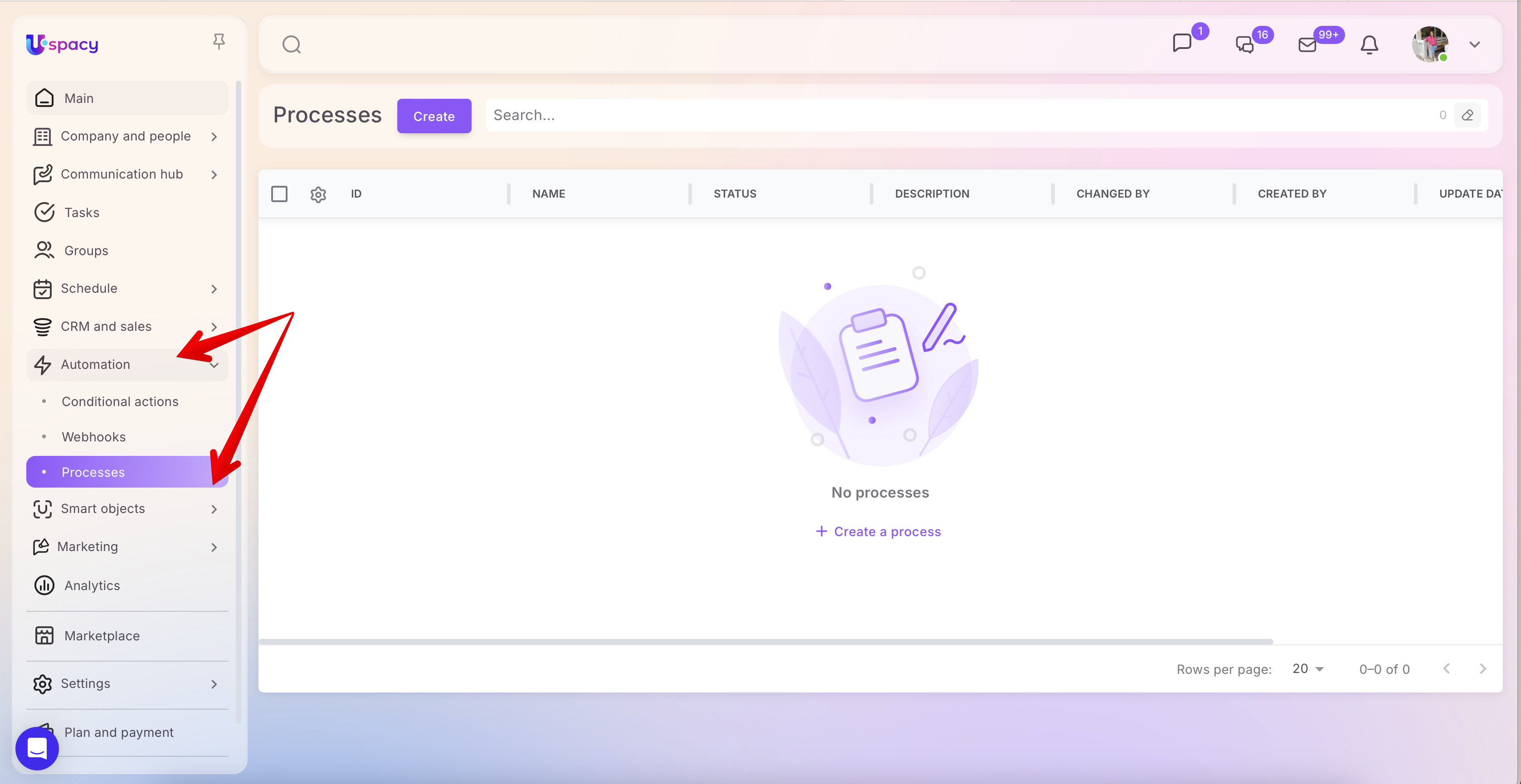 All work with Processes takes place on the page of the same name in the Workspace. To access it, expand the Automation section.
