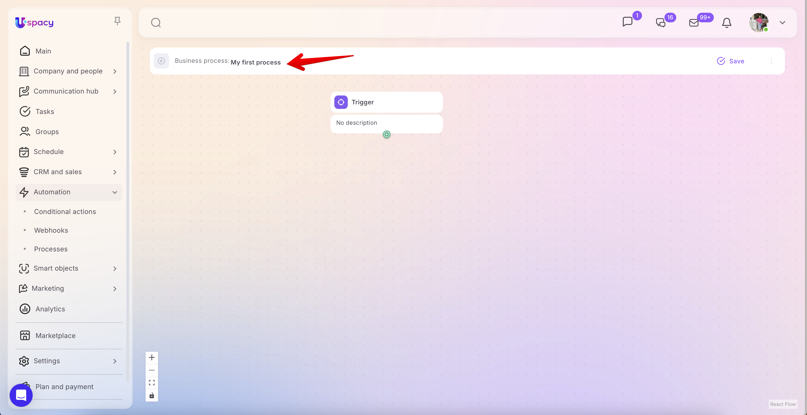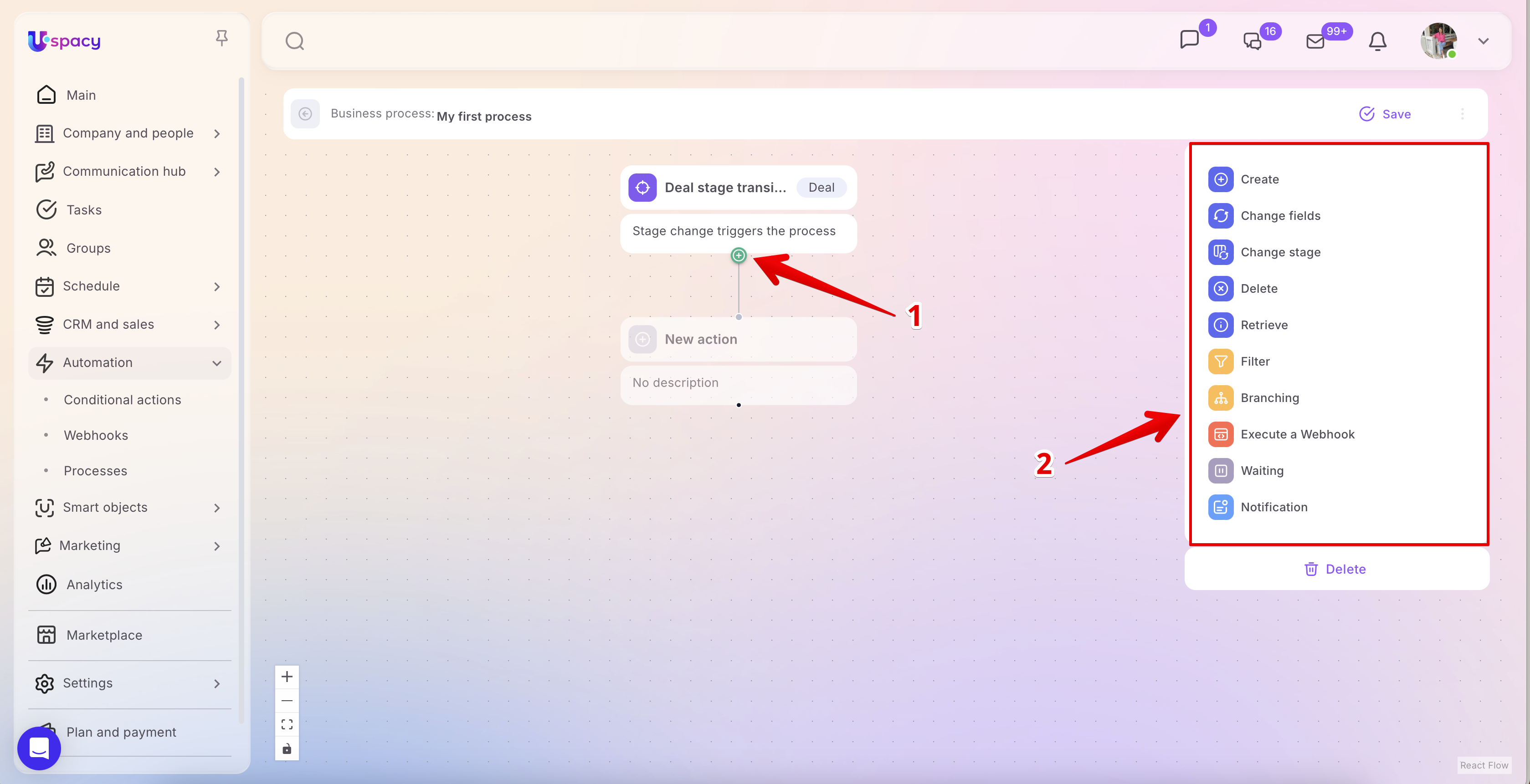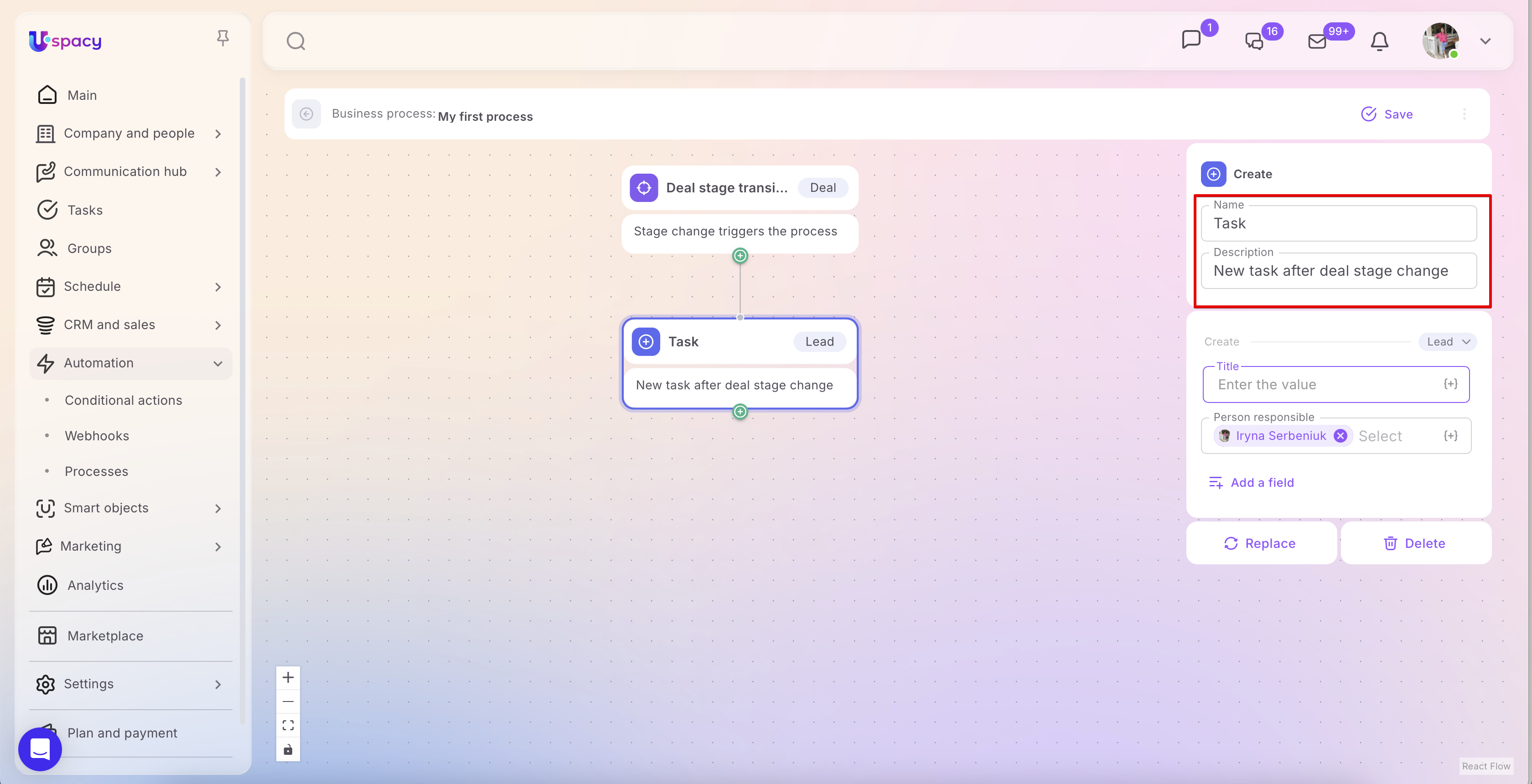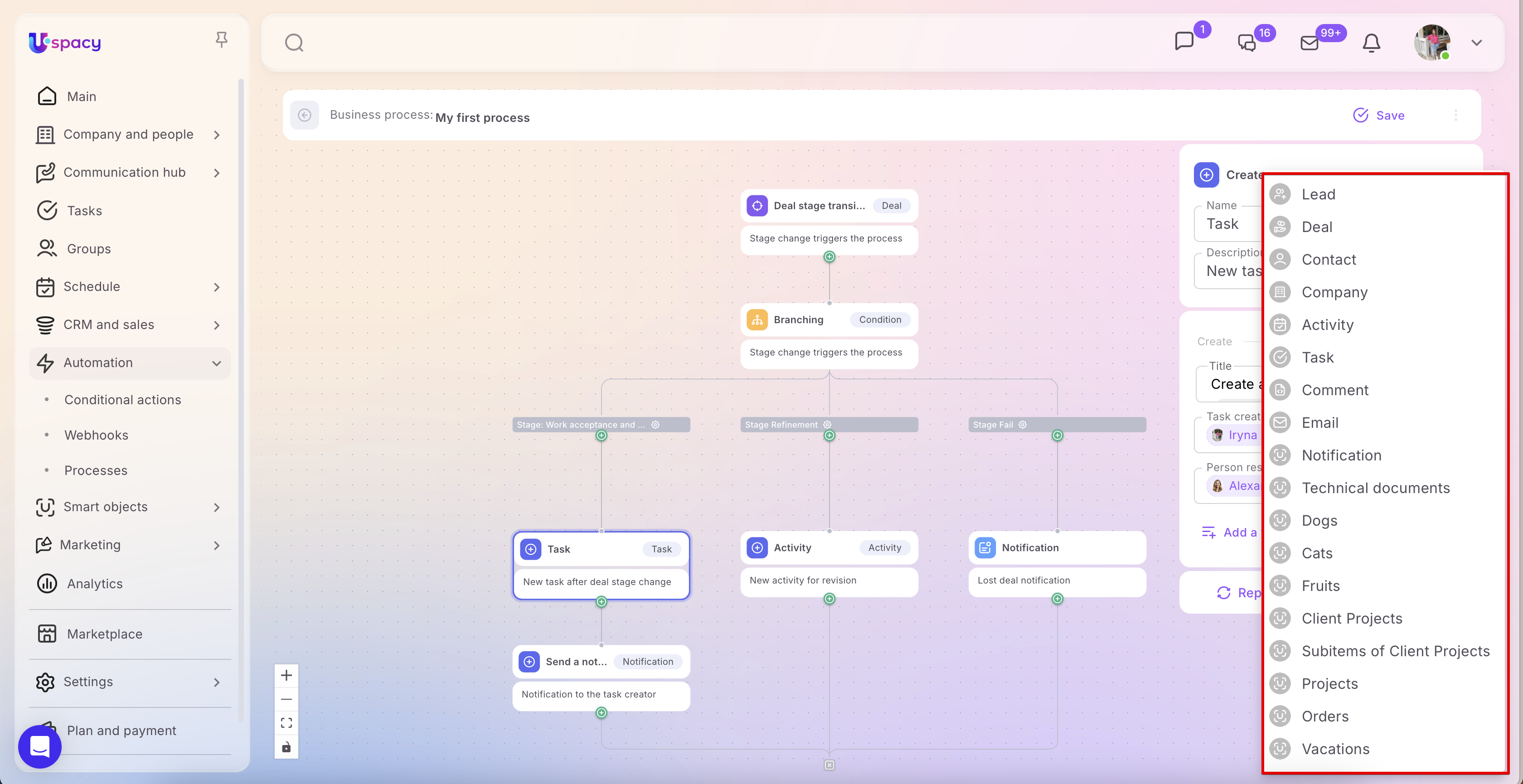 Previously, automation in Uspacy was primarily represented by Conditional Actions. Now, Processes are also available—a new type of automation. Processes allow you to design the flow of a business process, define the sequence of actions, and better manage team workflows within a single scenario.