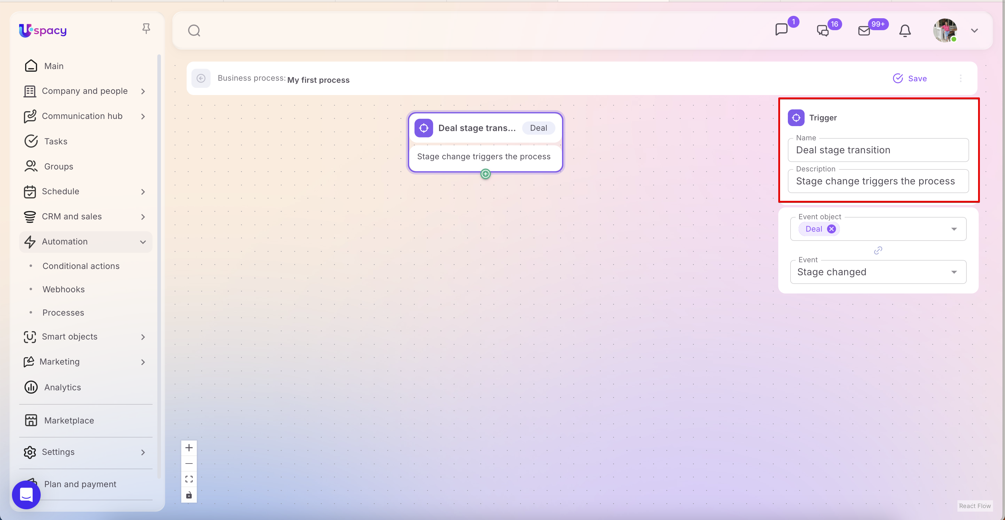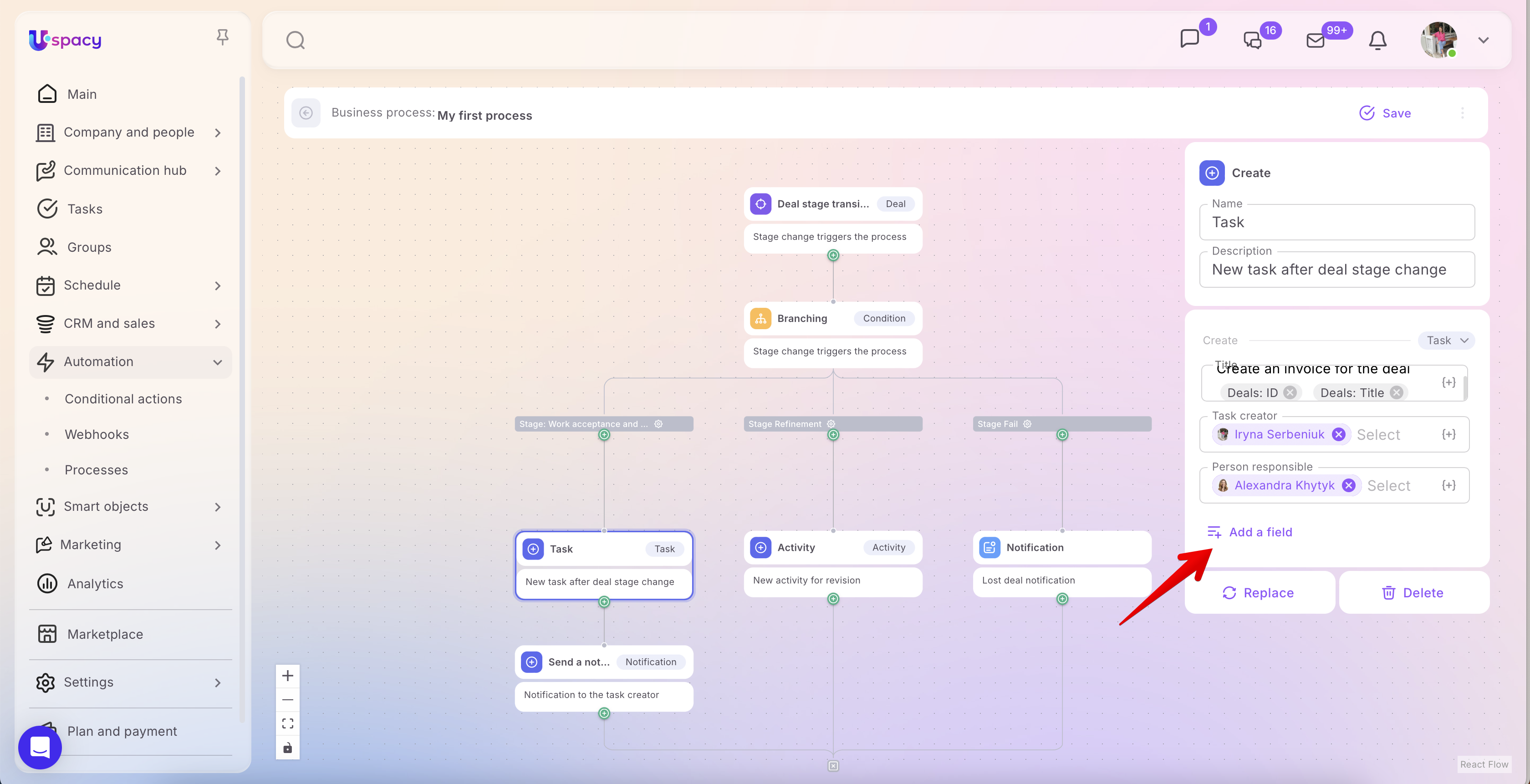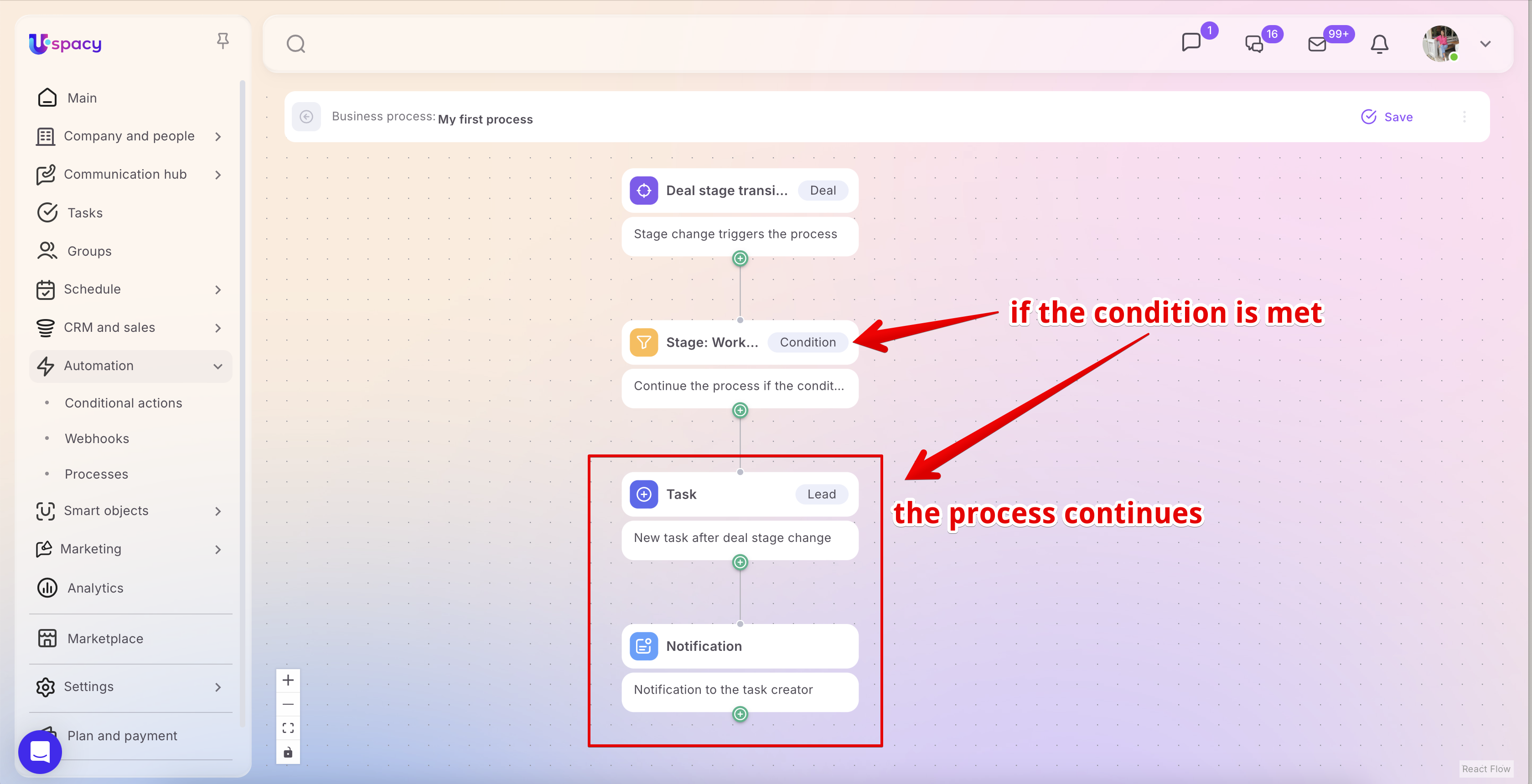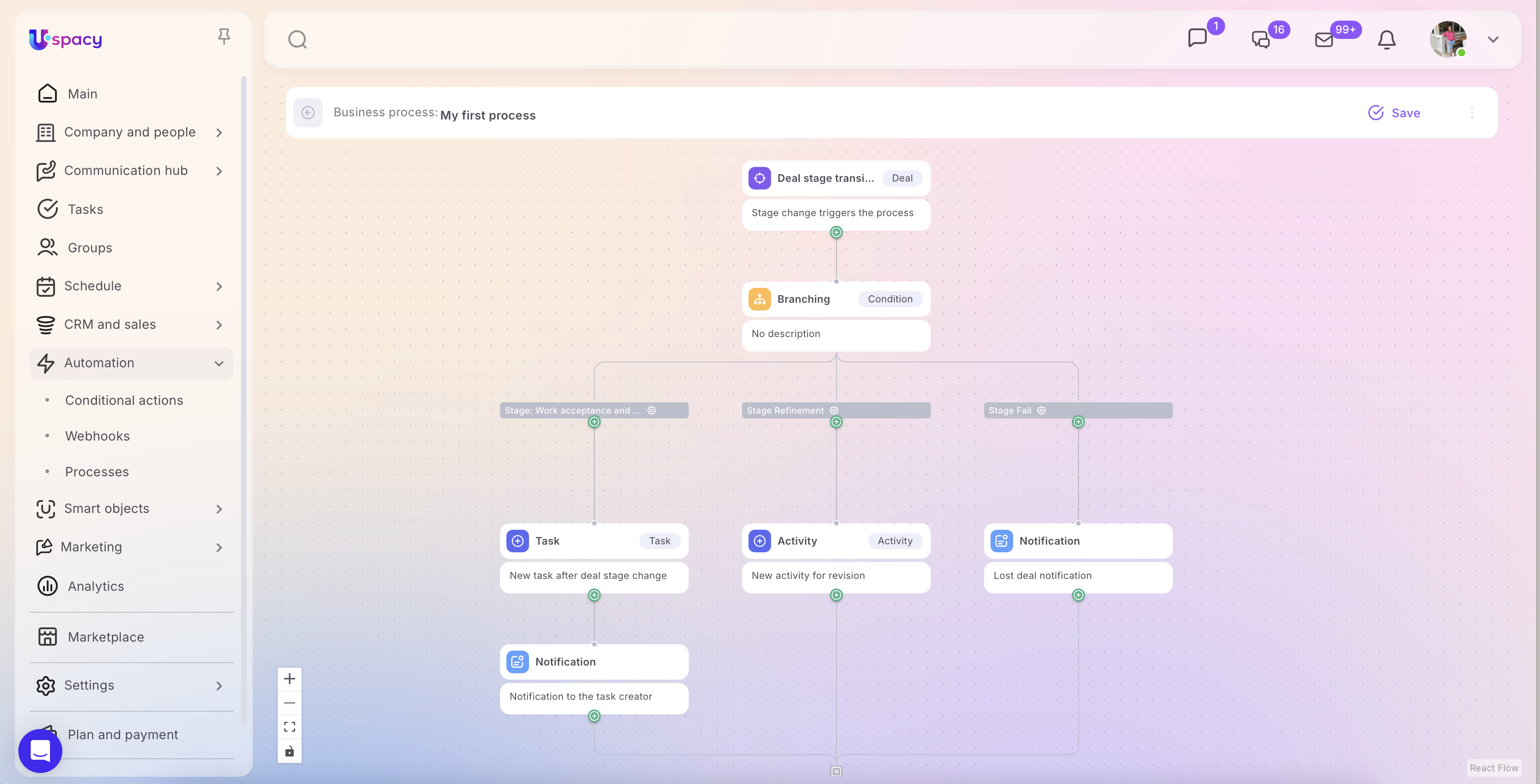 In summary, Processes are another type of automation in Uspacy that help build complete workflows with conditions, branches, and sequential steps. This allows teams to spend less time on routine tasks, respond more quickly to changes, and maintain a unified workflow logic across the Space.