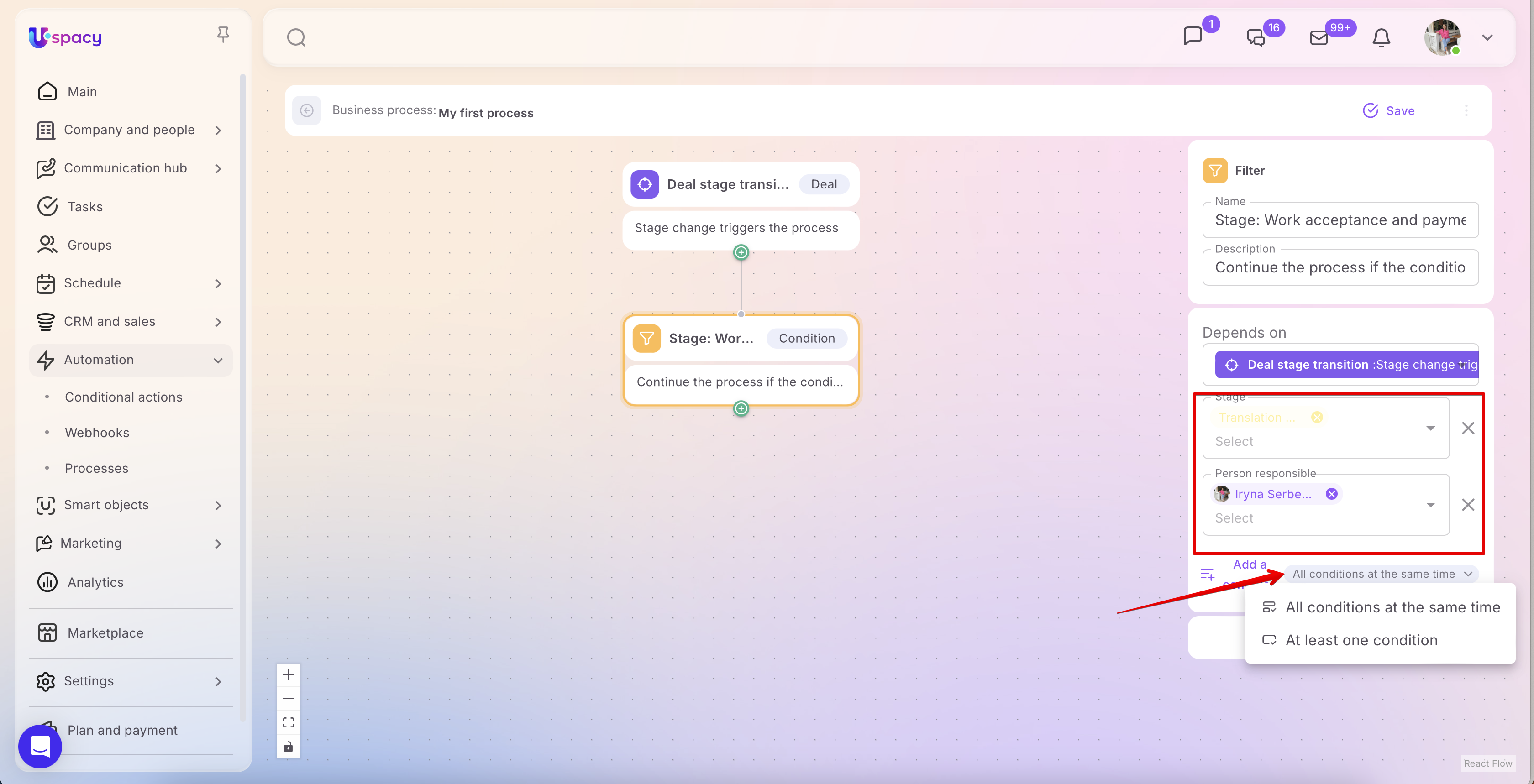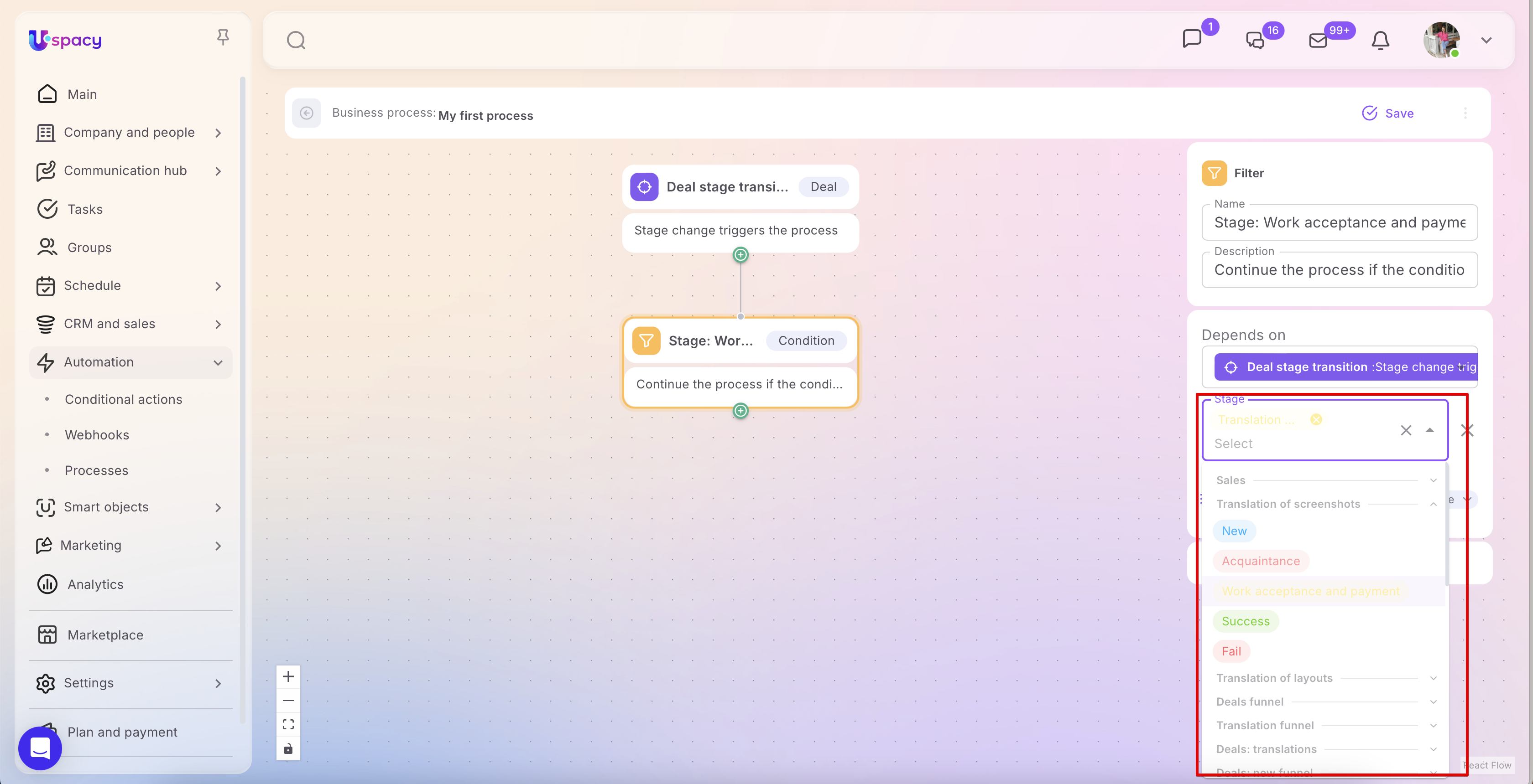 ➢ Example: In a process, you can set a condition that a deal must move to the “Work acceptance and payment” stage. If this condition is met, the process will continue and execute the next action. If the deal moves to any other stage, the Filter will block it, and the process will stop at this check.