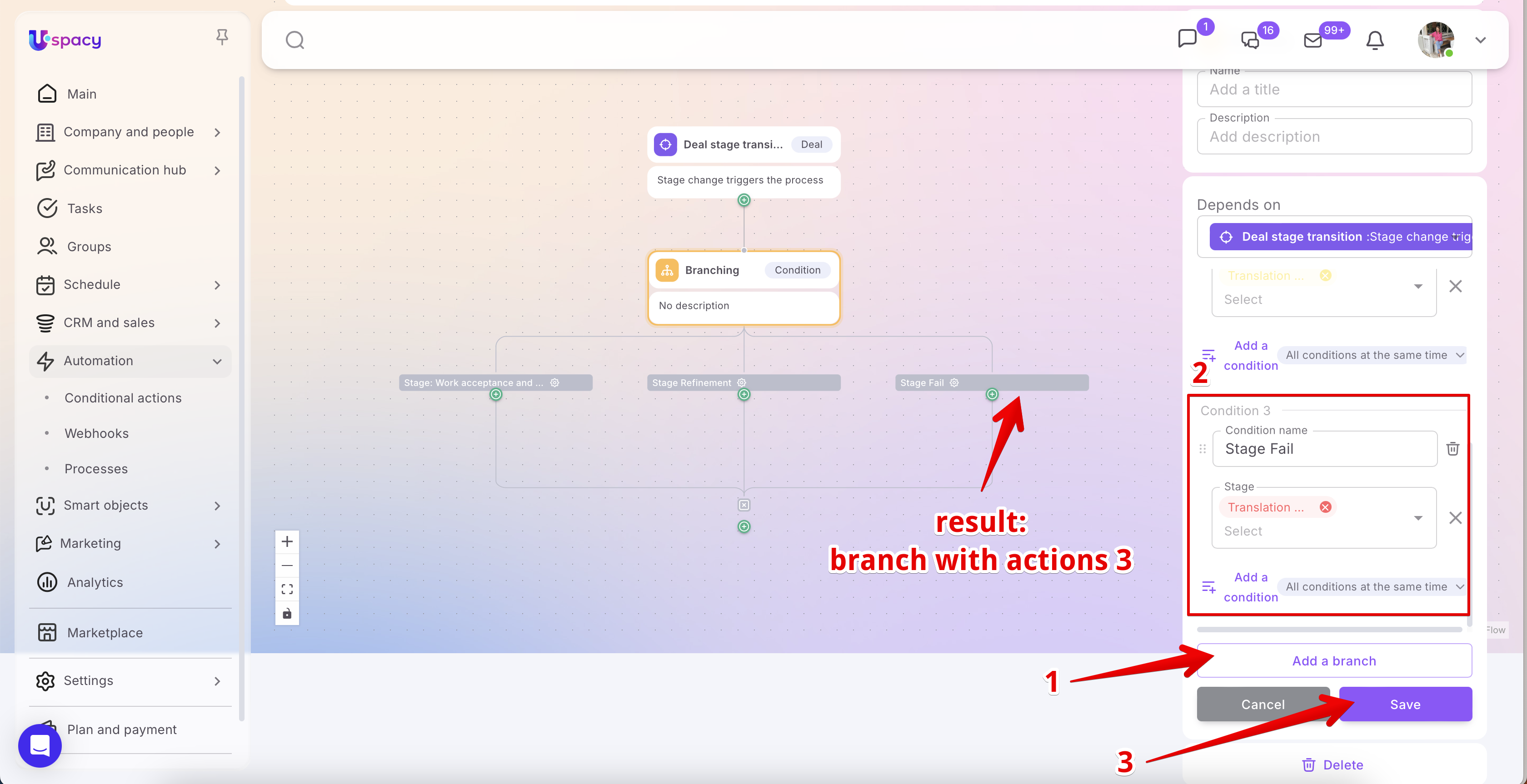 The main advantage of this action is that it allows you to combine multiple checks within a single process. Instead of creating several separate automations for different conditions, you can build one clear process with multiple branches. Branches can also be nested to configure more complex and flexible workflow logic.
