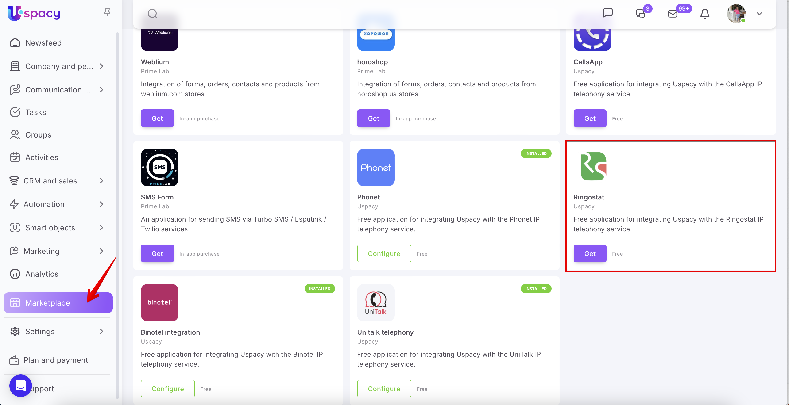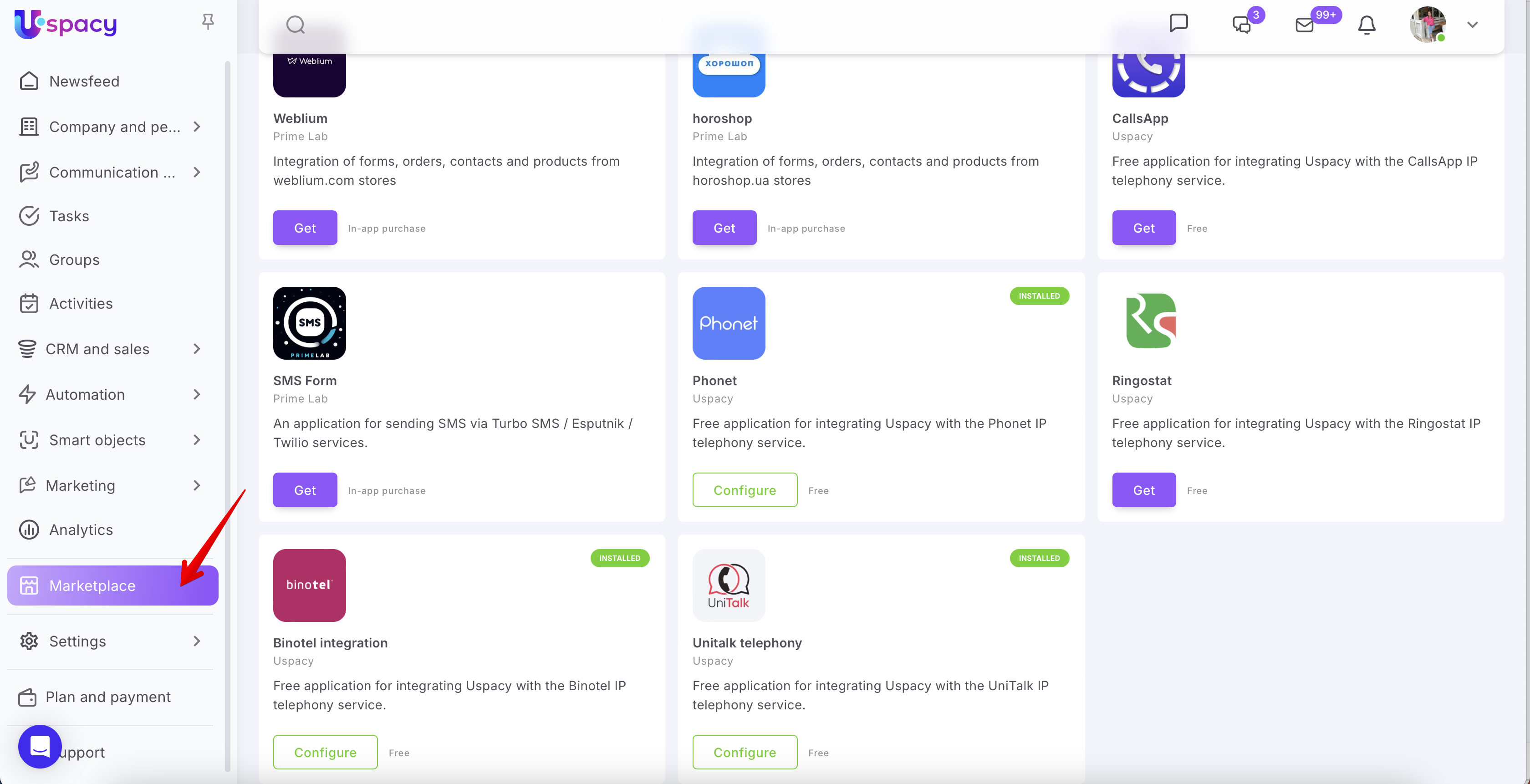 At Uspacy, telephony works through integrations with specialized services. In the Marketplace section there are free applications that, after installation and configuration, will allow you to call or receive calls from clients.