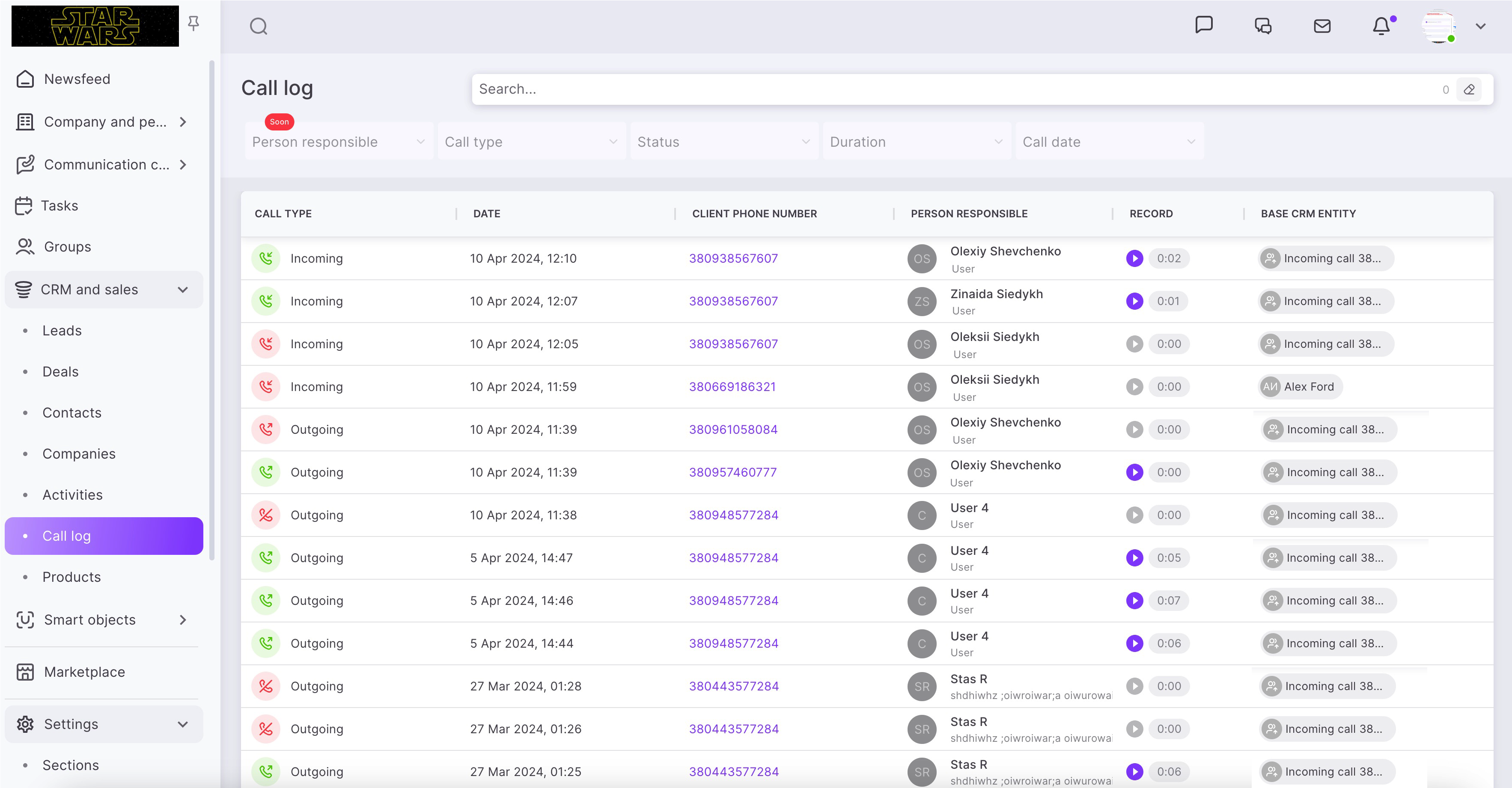 ☎️ All calls (incoming, outgoing and missed) will be saved on the Call log page. Here you can process calls, for example, listen to recordings of conversations or go to the card of the related CRM entity.