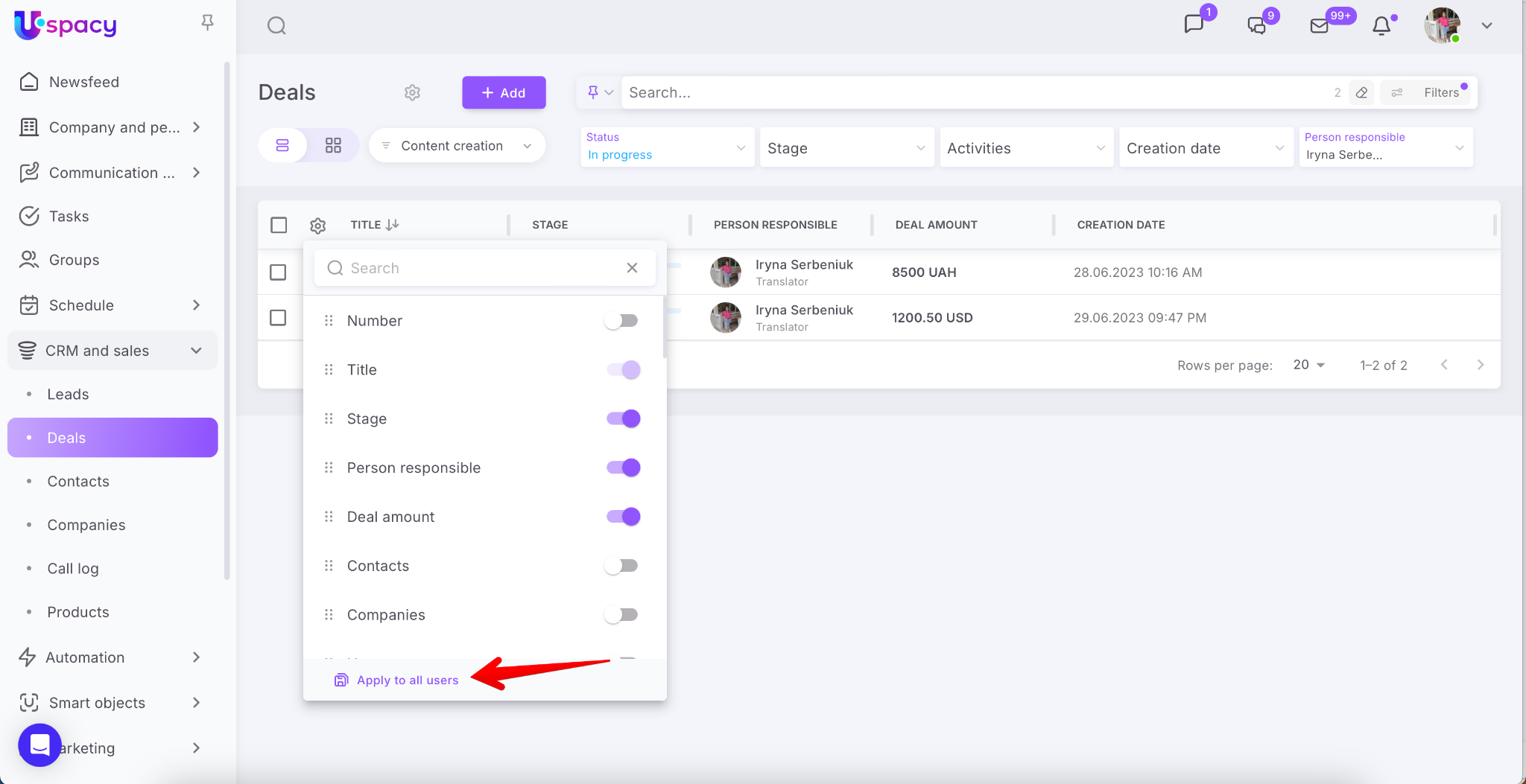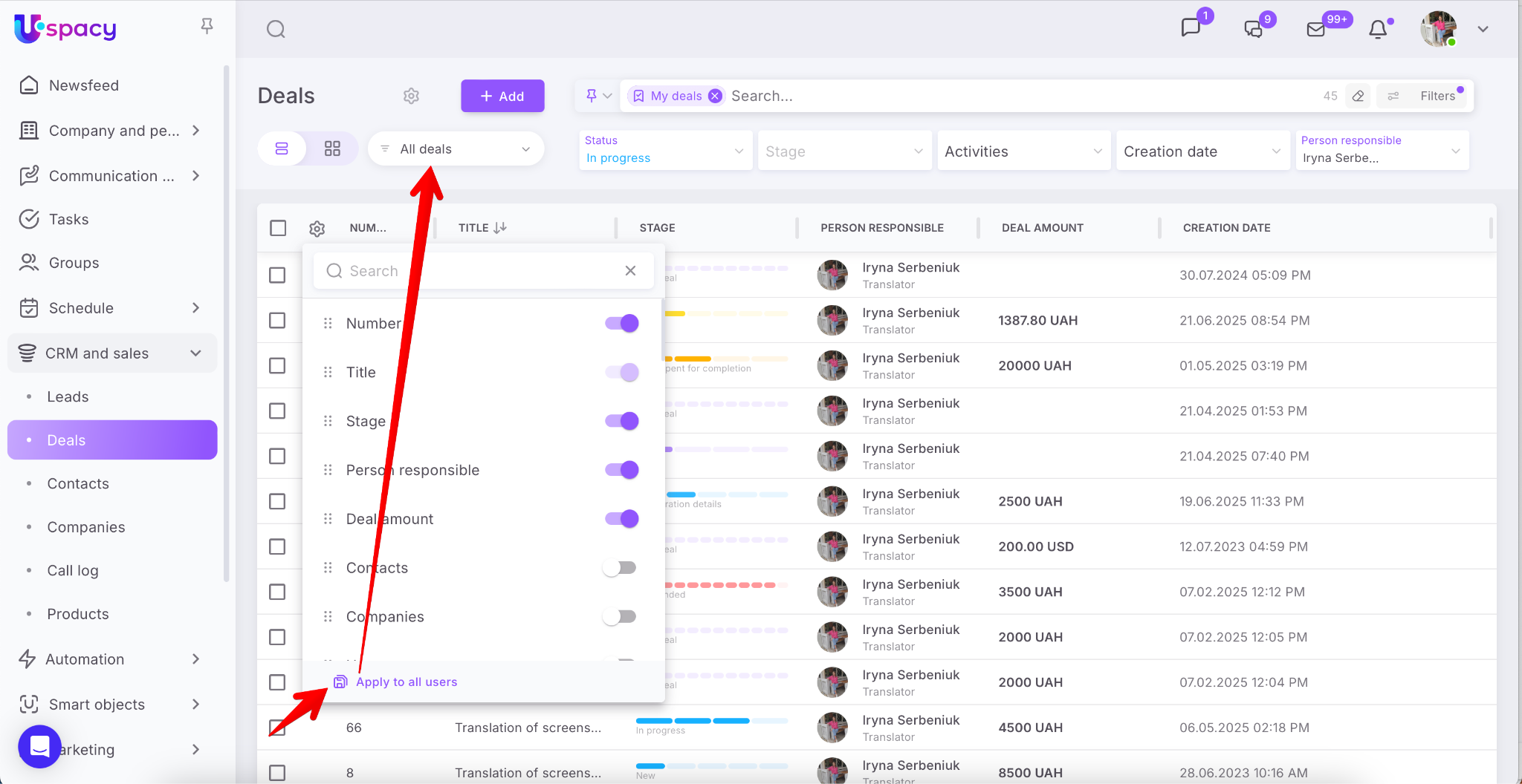 🟣 If an administrator or Space owner selects the “Apply to all users” option in a specific funnel, the table view settings apply only to that funnel (or direction in Smart Objects), not to all.