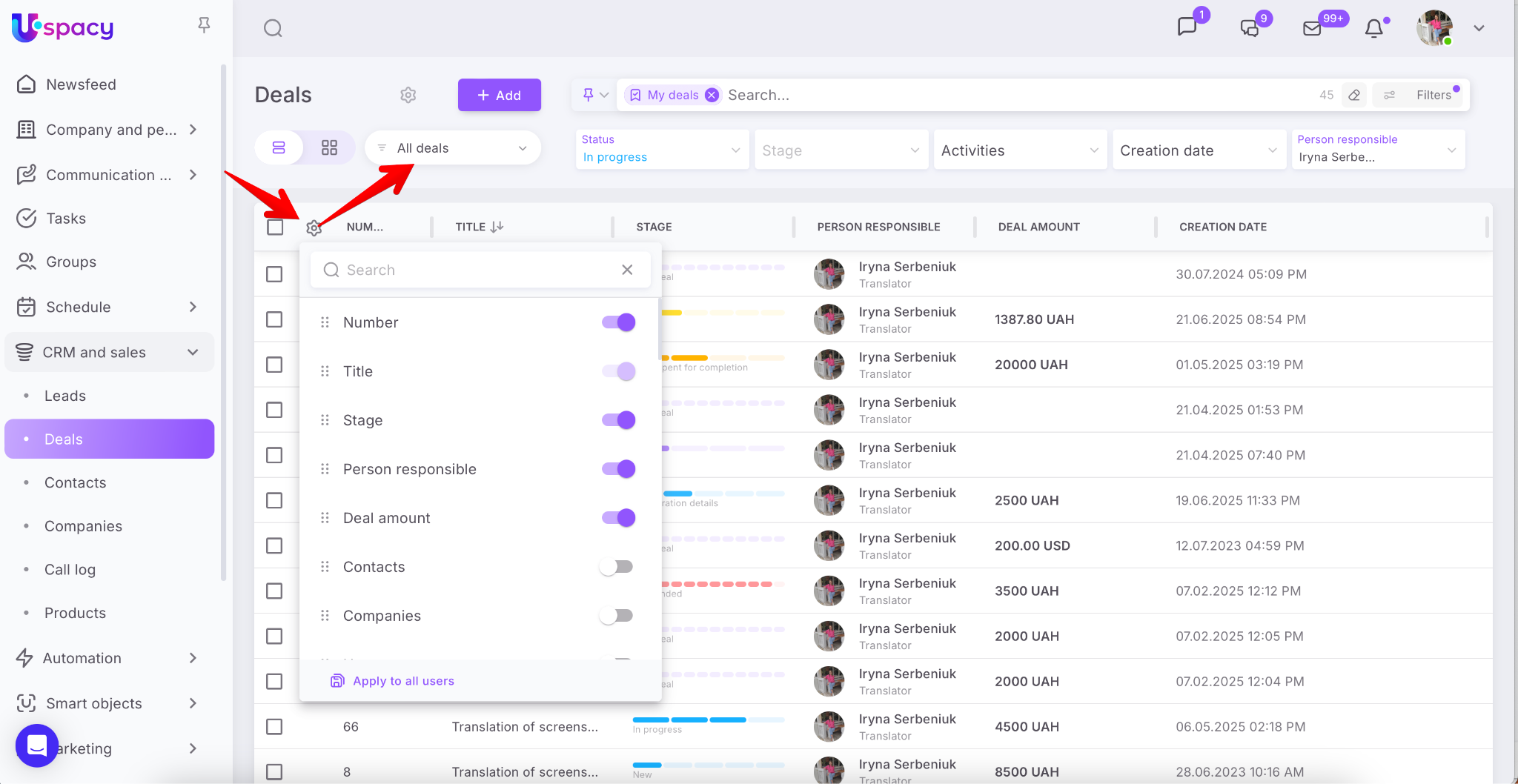 In Uspacy CRM, you can personalize the deals or leads table for specific business processes. Now, field display settings are saved separately for each funnel. This allows you to work with data as conveniently and efficiently as possible. For example, in the “Translations funnel” you can view one set of parameters, while in the “Content creation funnel” – another.