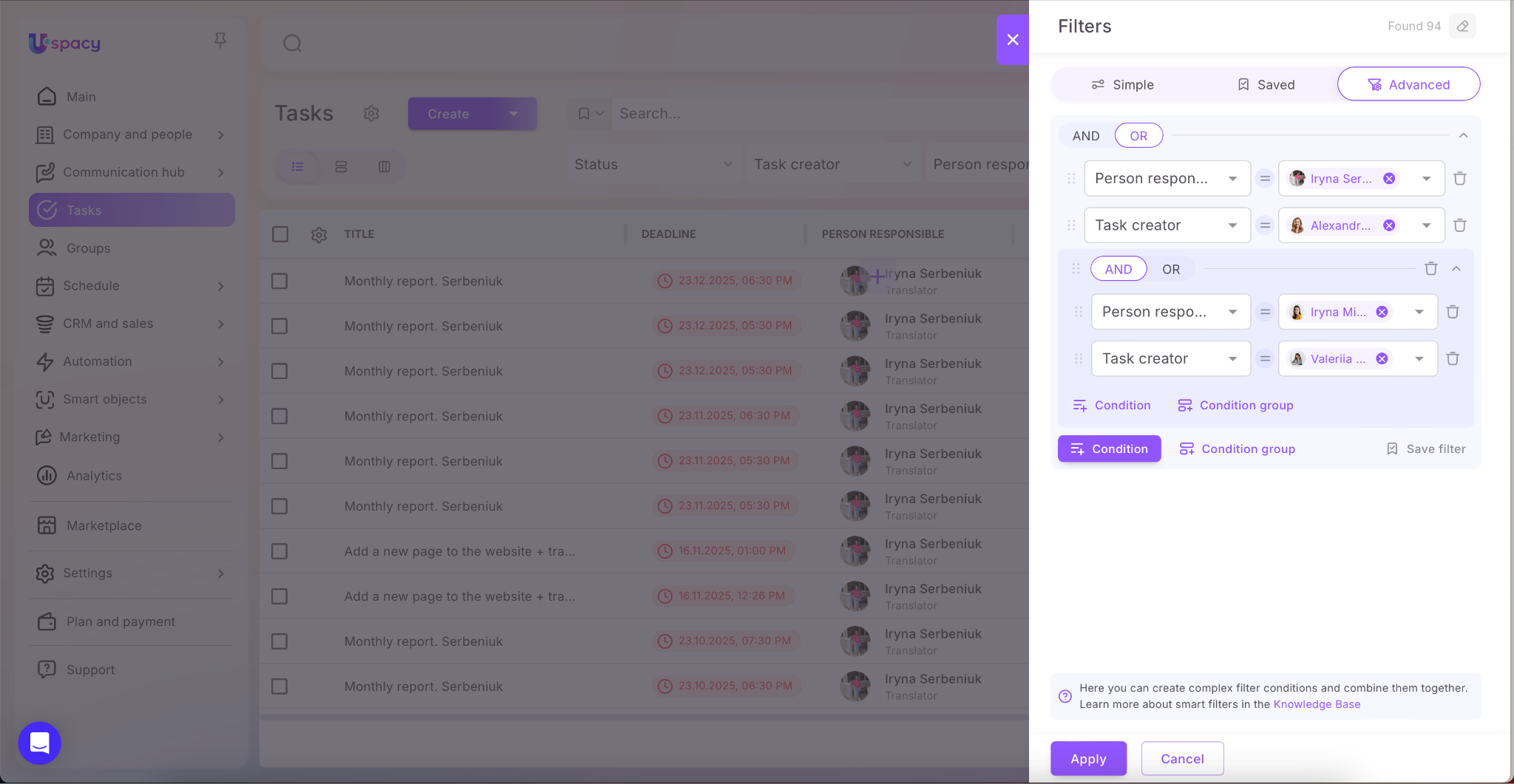 π£ Advanced task filters β a radical new level of flexibility when working with tasks! You can now use a variety of match operators like equals, does not equal, is filled, is not filled, contains, does not contain, etc. You can also group fields in filter sets and apply your own logical AND/OR operators between them. This enables highly precise and complex task queries.