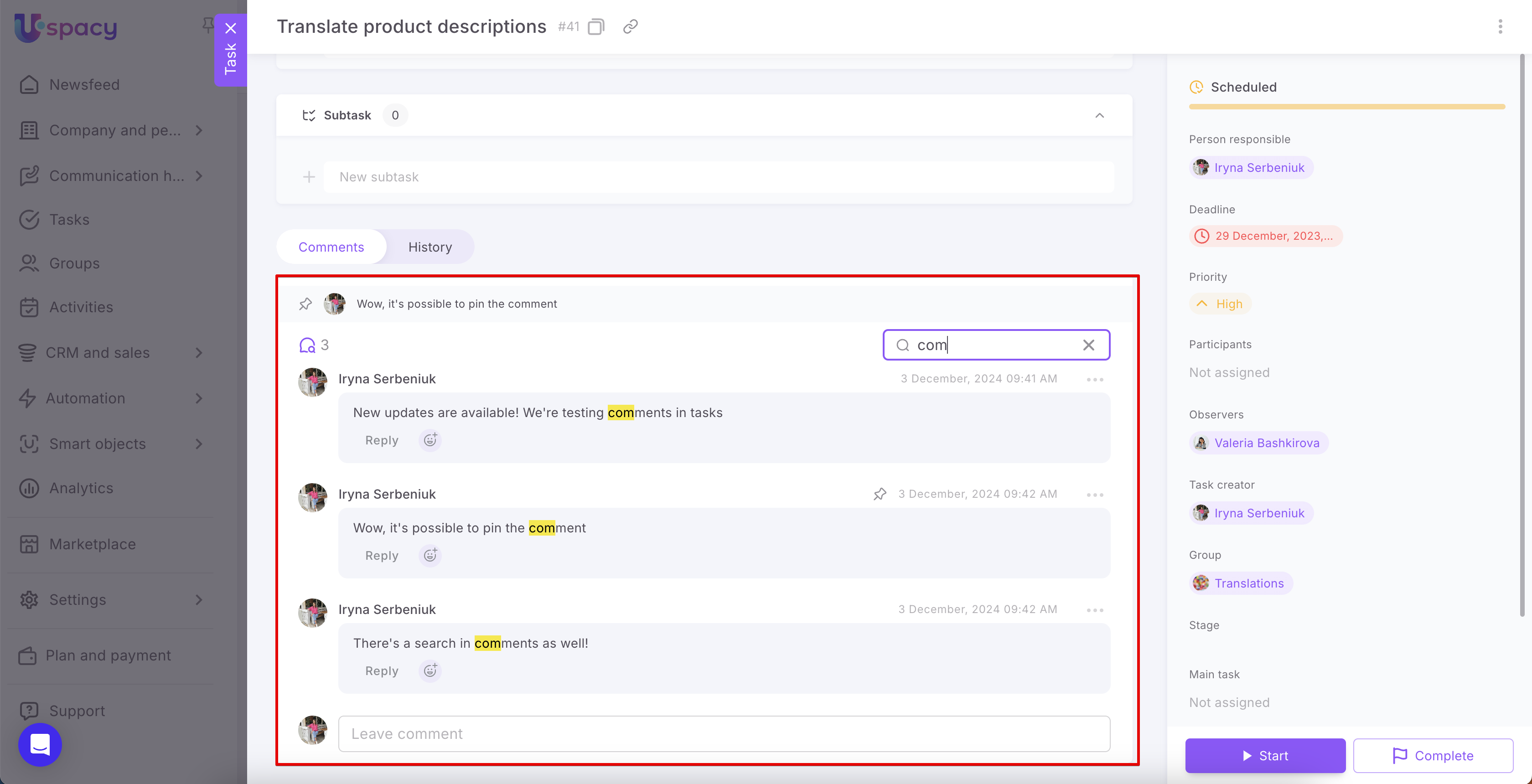 🟣A major update also affected the commenting system for posts or tasks. It’s possible to pin important comments, go to them, search for text by partial or full match and more. The design is updated as well.