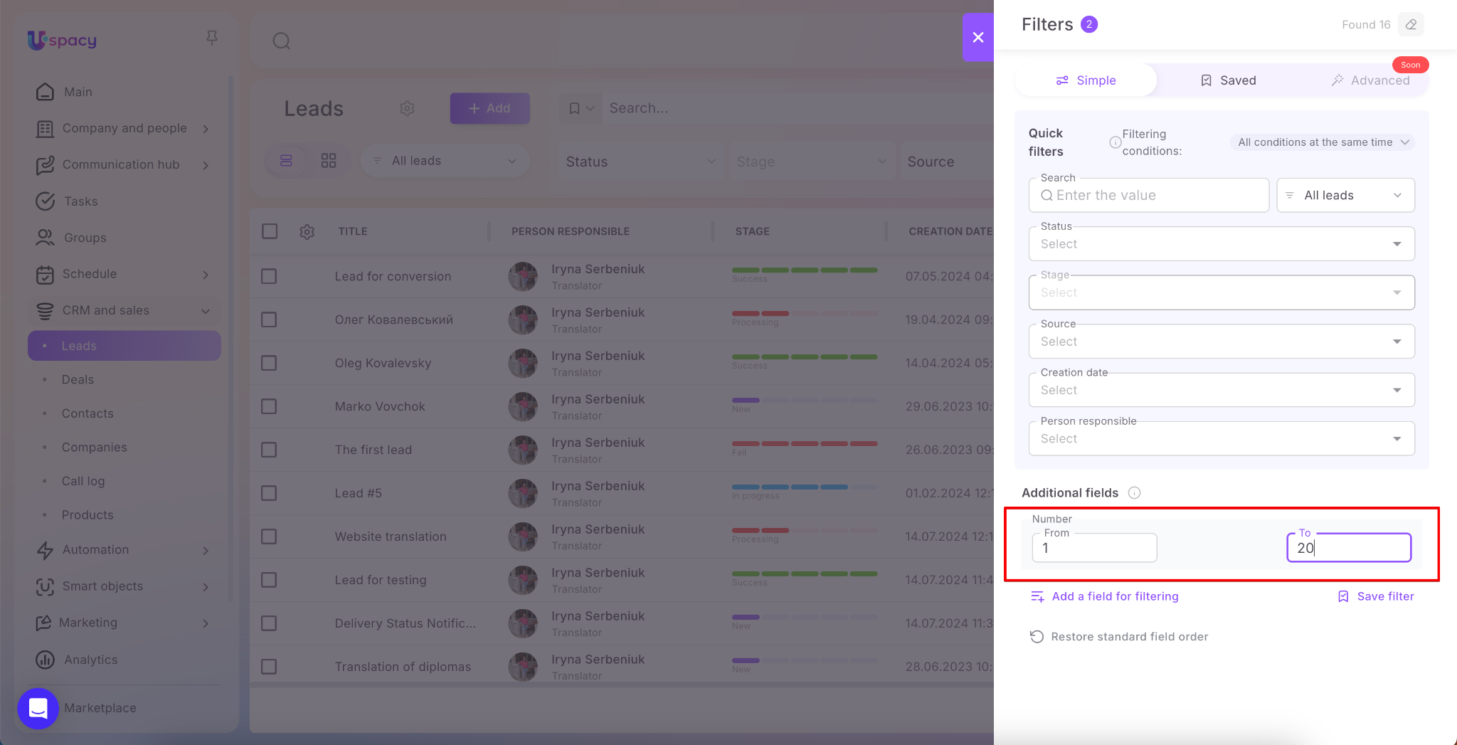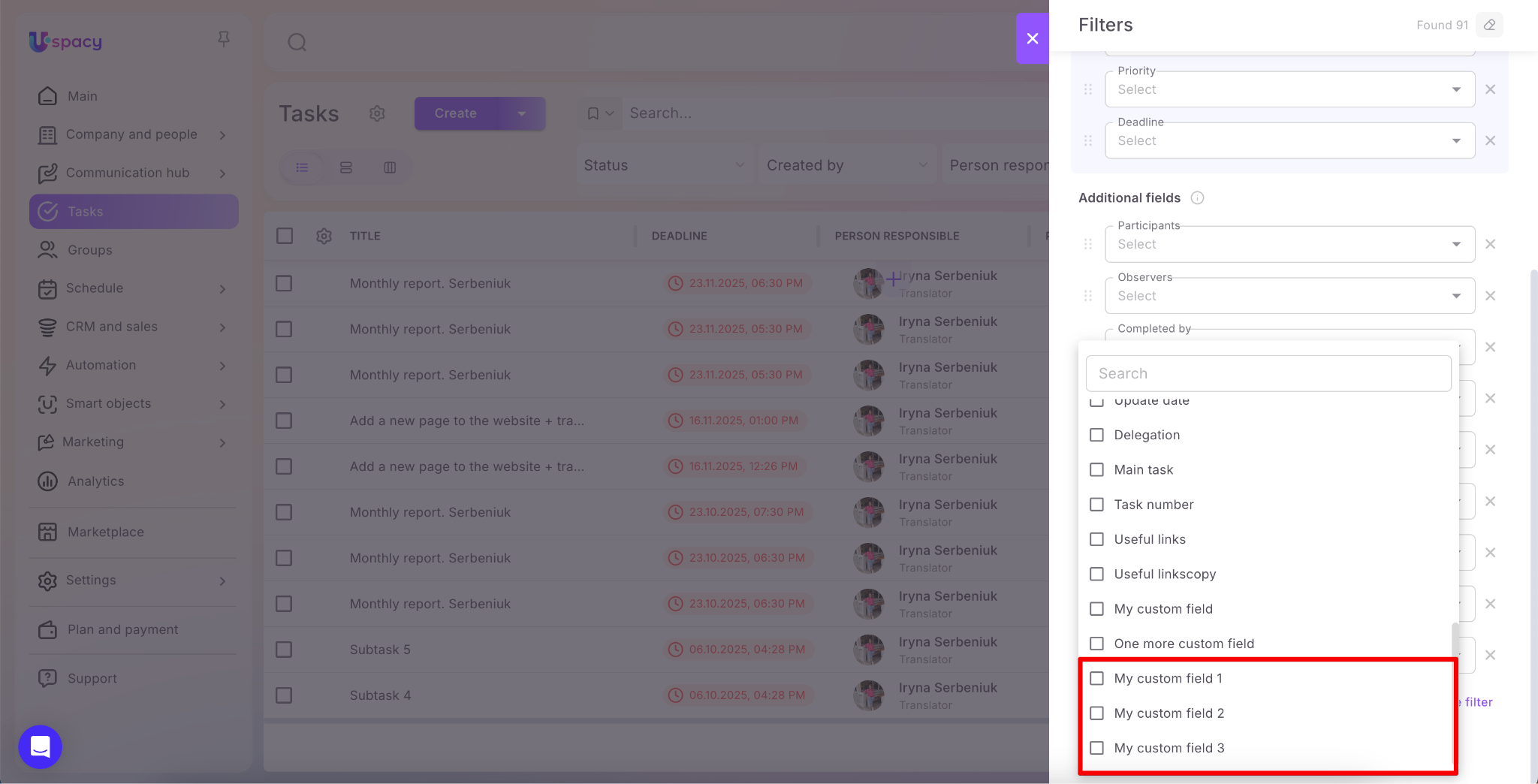 🟣 Custom fields in Task filters, recently added to Uspacy, now allow you to filter tasks not only by standard parameters but also by any custom fields you’ve created. This makes finding the right tasks more flexible than ever.