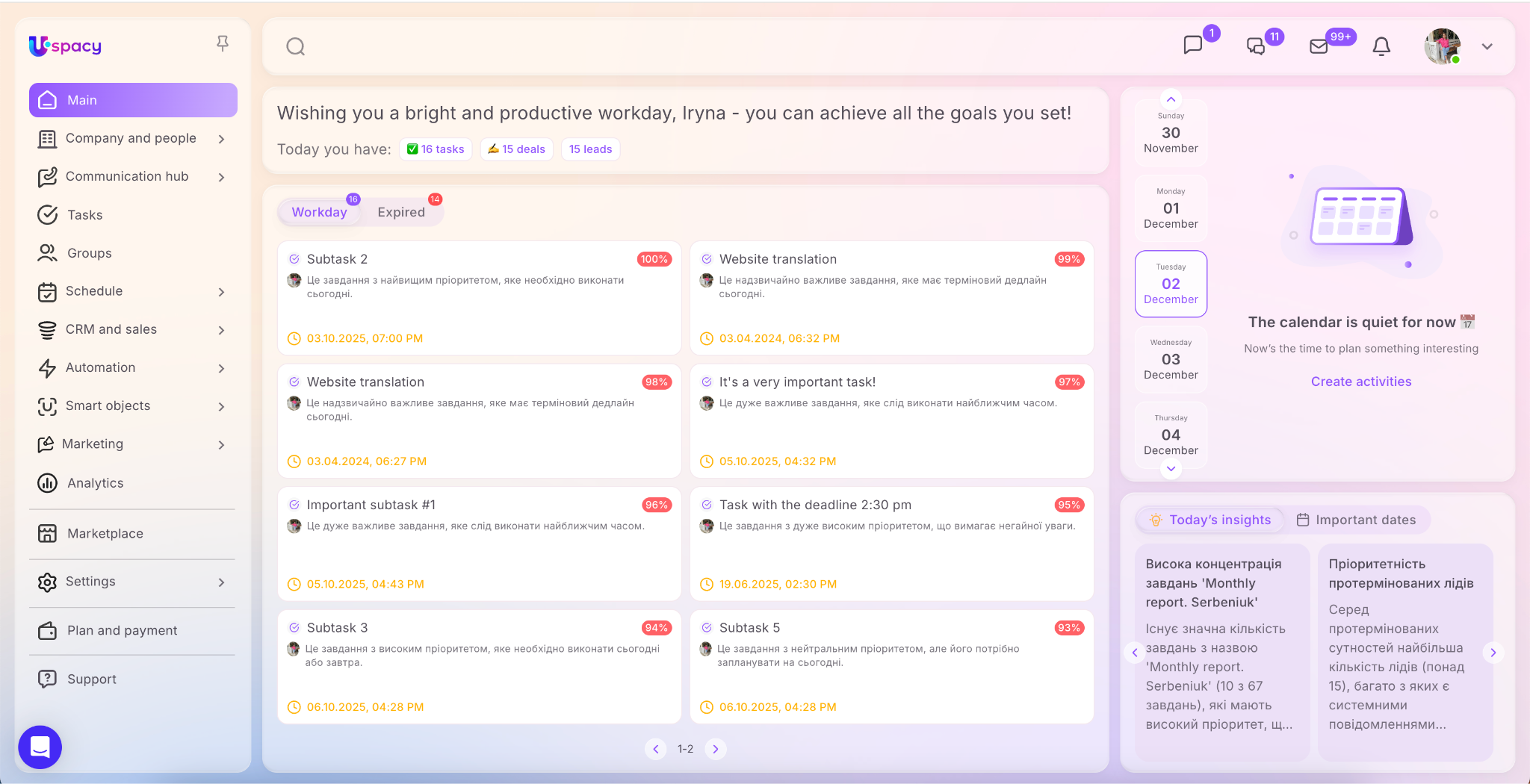 🟣 The new design of the main page — an AI-powered workspace dashboard that completely transforms the start of your workday! Now, when you open Uspacy, you’ll see a summary of everything scheduled for today, broken down into tasks, deals, and leads. Upcoming events are shown separately, along with smart insights that offer suggestions to improve your workflows. Everything is designed to help you stay focused on what matters most and start your day as productively as possible!
