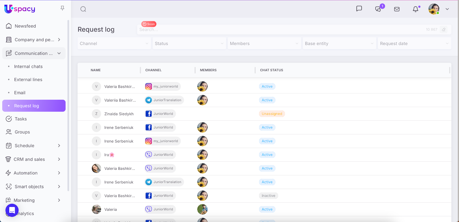 🟣 The Request log — a convenient tool for admins and support managers. It provides a complete list of all client chats, showing who is responsible for each conversation, which channel the client used, and allowing you to quickly open and manage any chat.