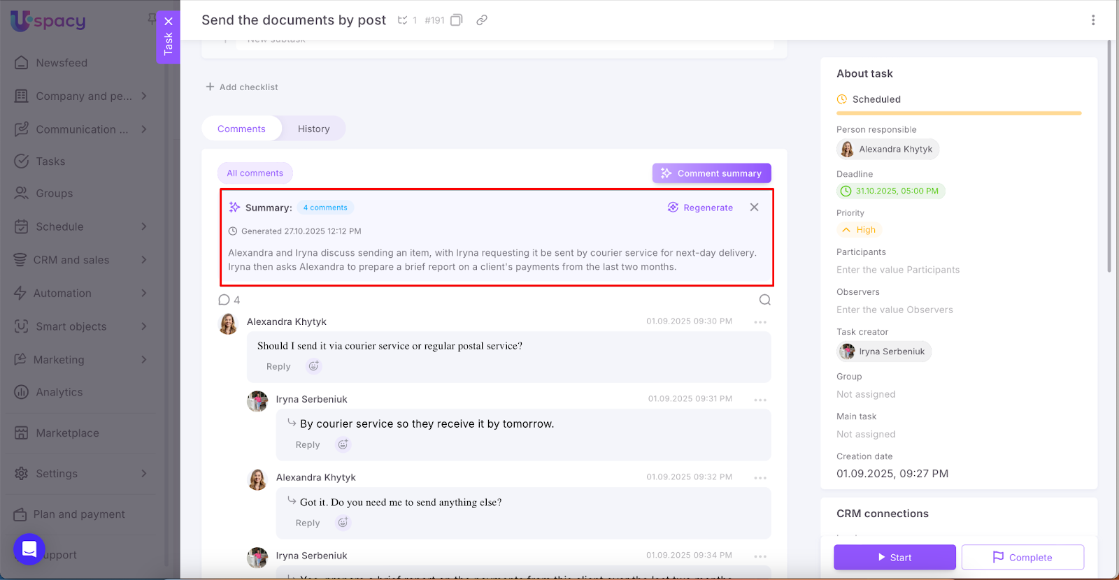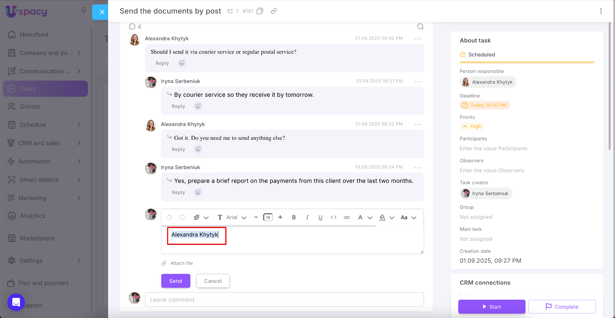🟣 Automatic user mention when replying to a comment — a super convenient feature! When you reply to someone’s comment, Uspacy now automatically mentions the author so they receive a notification and don’t miss your response.