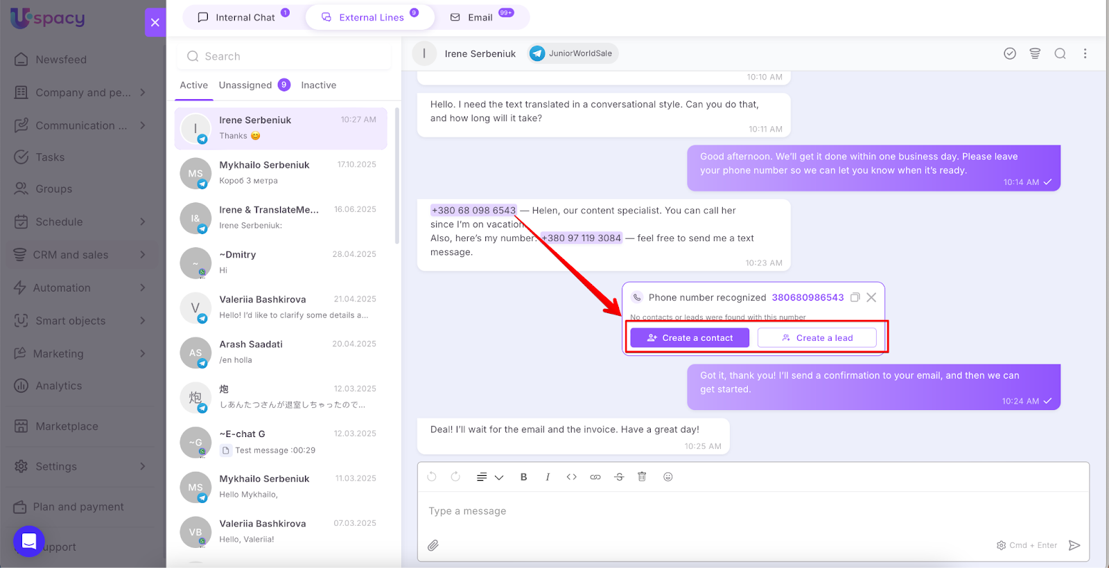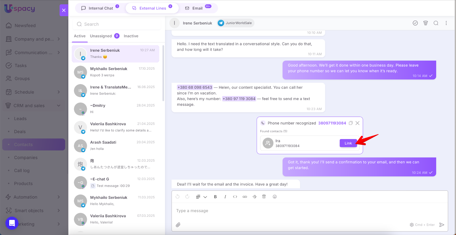 🟣 Automatic phone number recognition in External Channel chats — this helps you quickly identify clients. If a match is found, Uspacy will suggest linking the existing client to the chat; if not, you can instantly create a new lead or contact. Super handy!