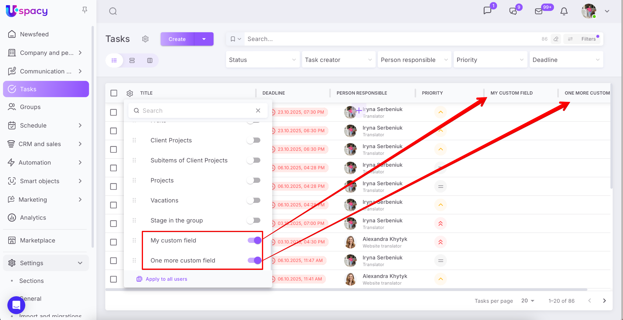 🟣 Display custom task fields in tables — now you can show custom task fields directly in the table view, making it easier to sort and manage large volumes of tasks according to your business specifics.