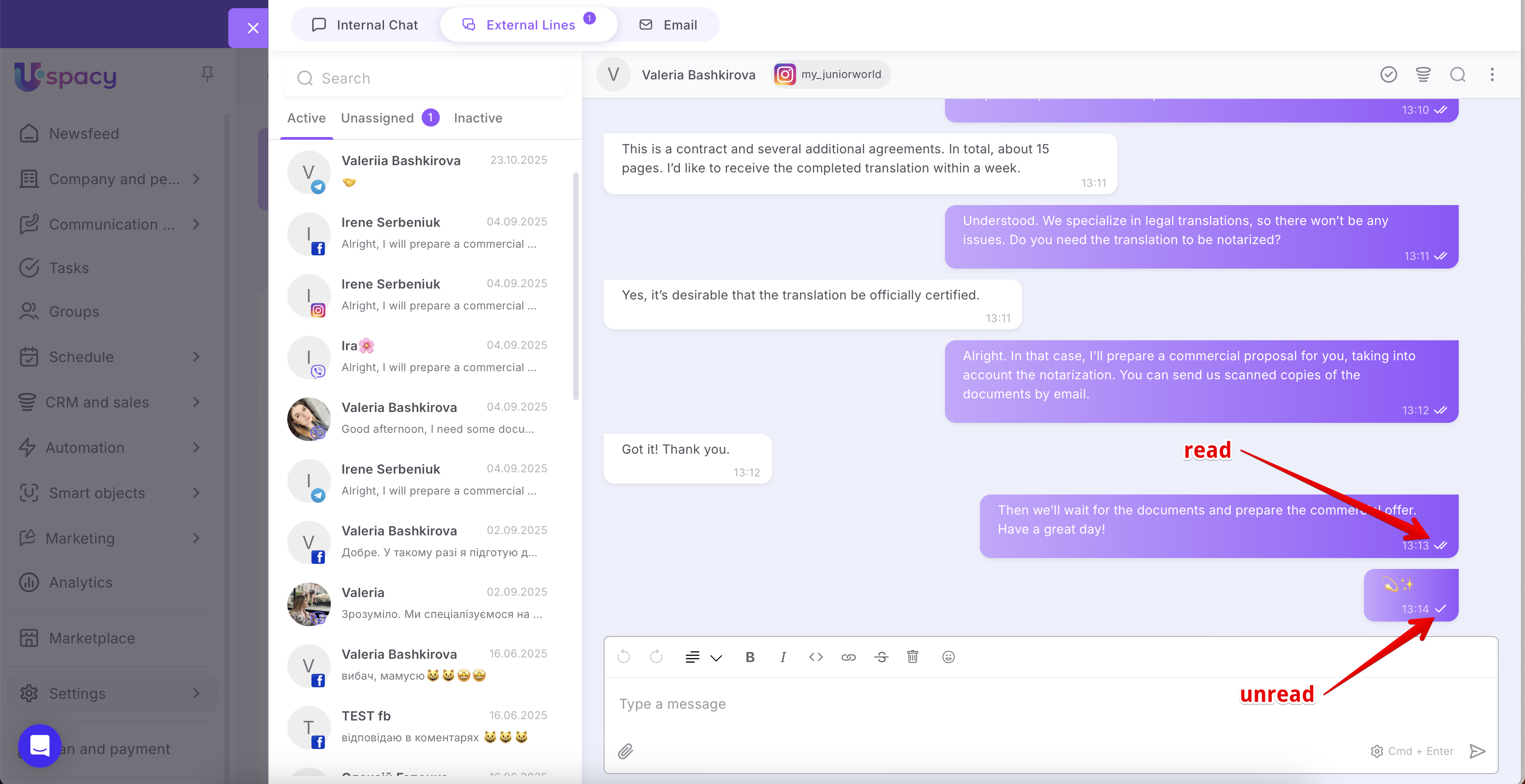 🟣 Read receipt status for client messages in External Channels (Facebook/Instagram) — now you can see whether the client has viewed your message in their messenger.