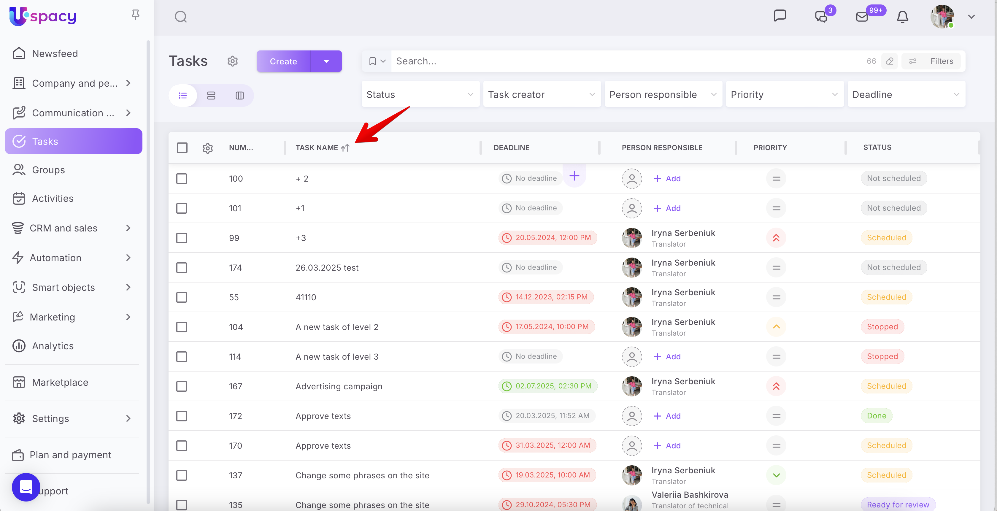 *In each column of the table where such sorting is logically possible. For example, it does not work for the person responsible, Participants, and Observers.