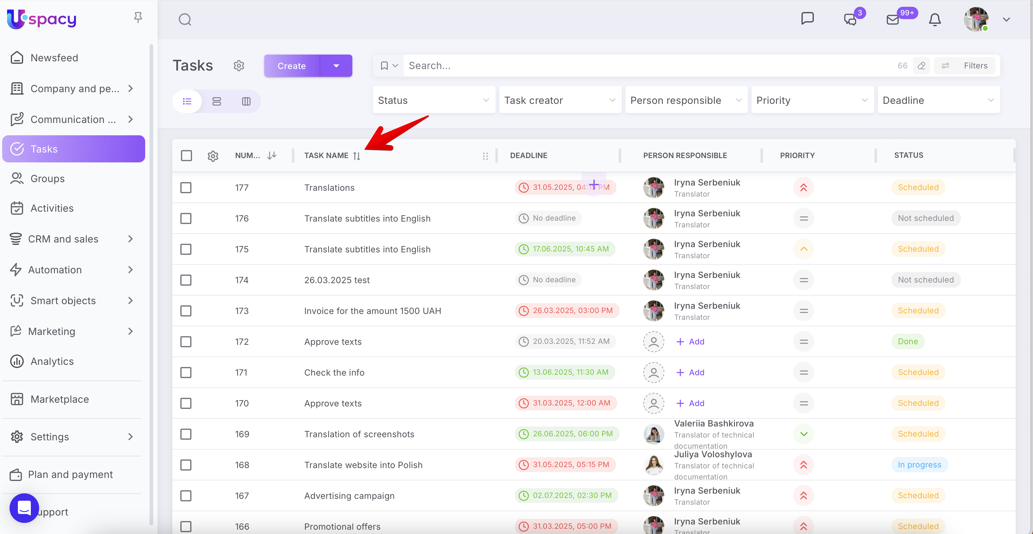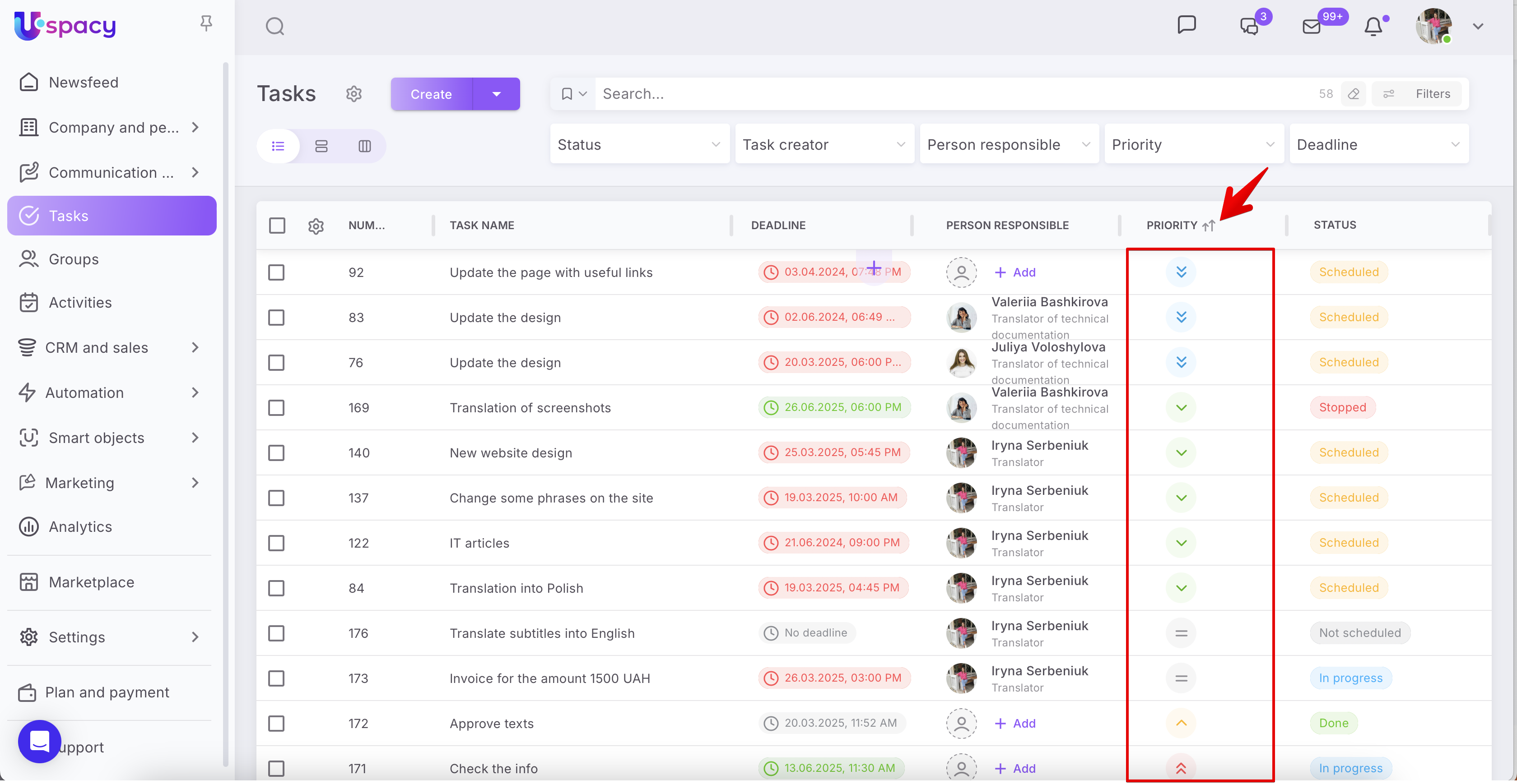 There is a search field and filters about the task: Status, Task creator, Person responsible, Priority, Deadline.