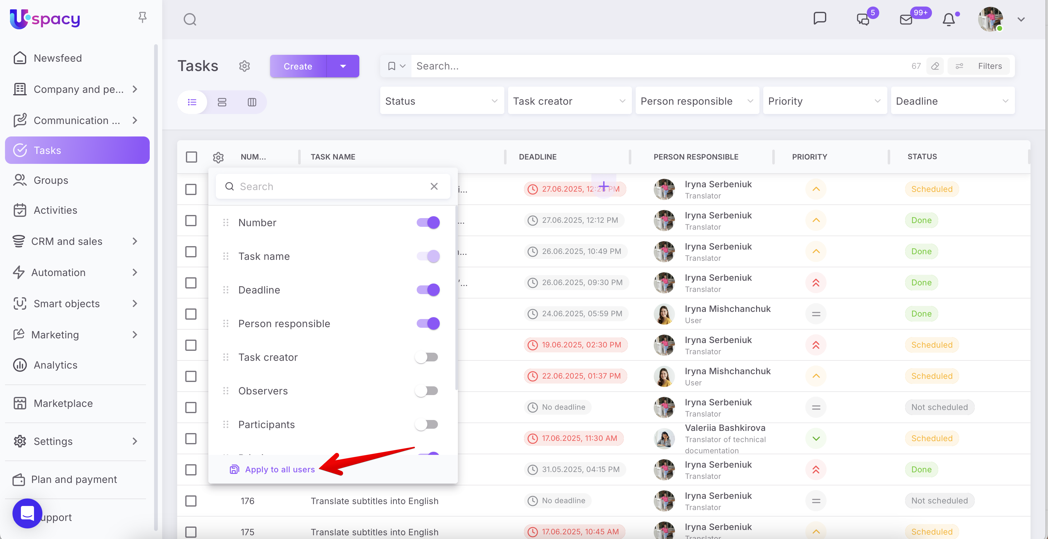 ☝🏻An administrator or the Space owner can also configure the optimal table view and apply these settings for all users at once. This ensures a unified approach to working with tasks within the team.